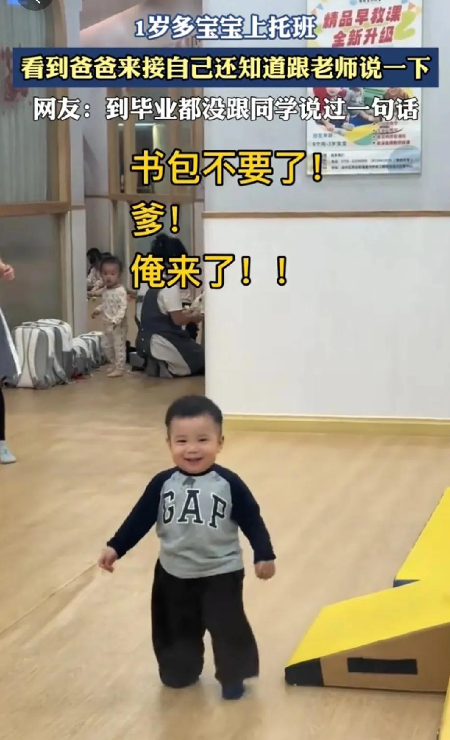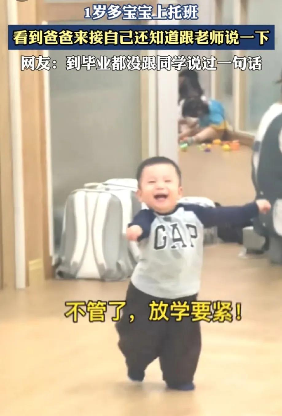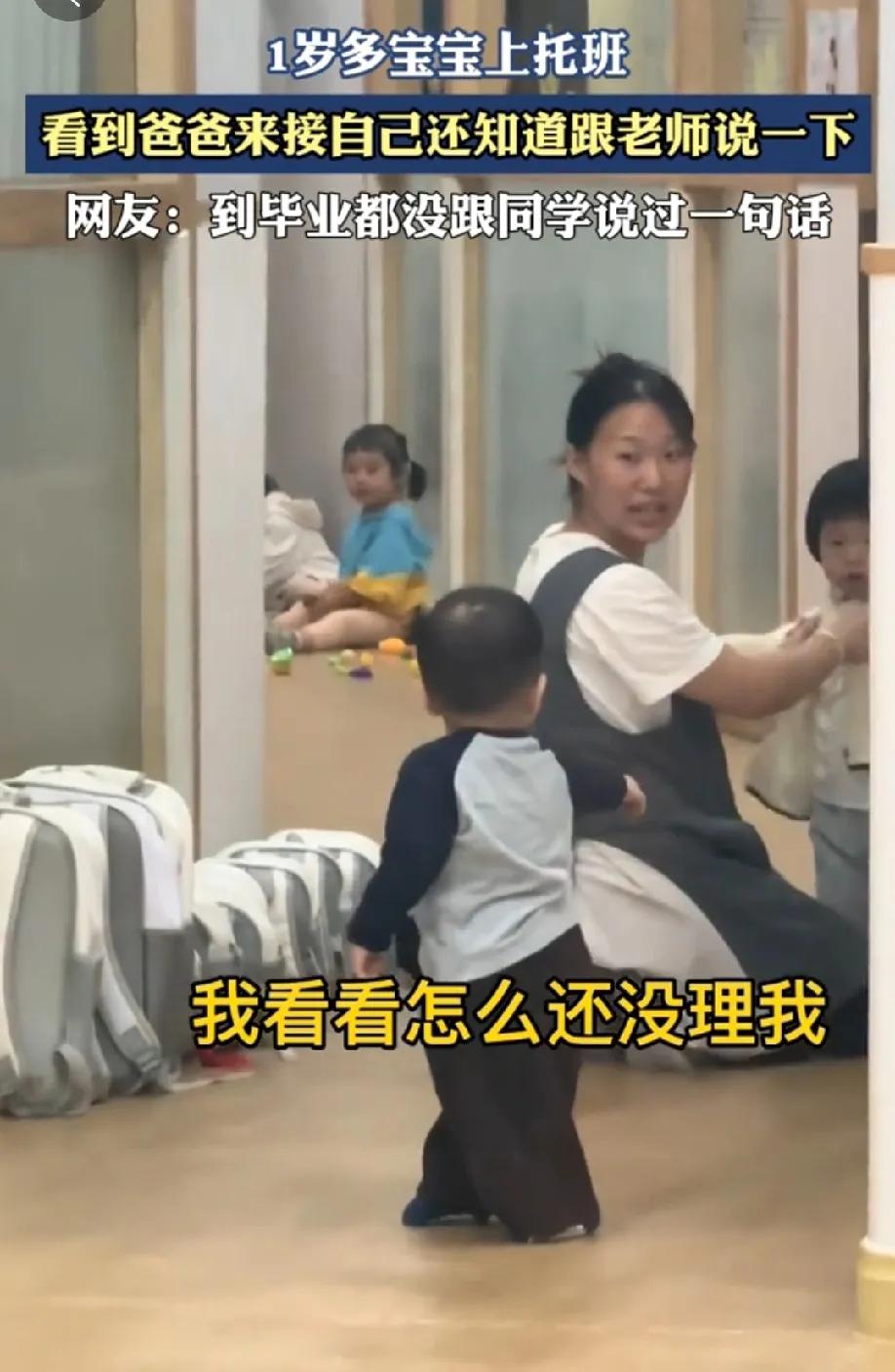 1岁多宝宝上托班,看到爸爸来接自己,一秒愣住,两秒委屈,三秒懂事得告诉老师,最后一秒愉快得冲刺。太可爱了! 扎着两只小手站那像小熊一样,小小的胖墩墩儿跑过来的样子,那小表情,感觉我的心都被萌化了。 不得不感叹,现在社会压力大,宝宝刚学会走路,就送托班了,又是一阵心疼。但凡有点办法,谁也不会那么狠心。 希望每位老师能充满爱去呵护每一个小宝贝,让他们能健康快乐成长!