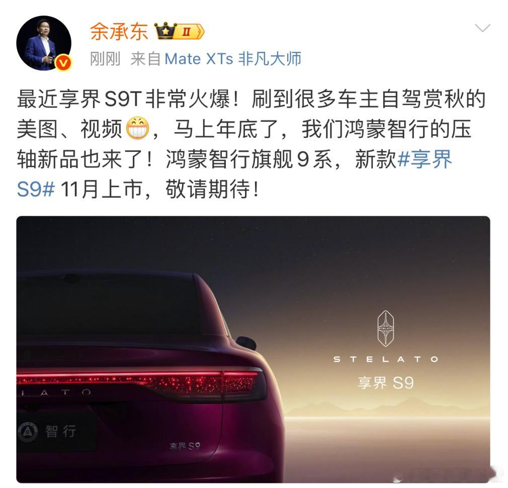 余承东曝新款享界S9将11月上市新款享界S9最新官图曝光