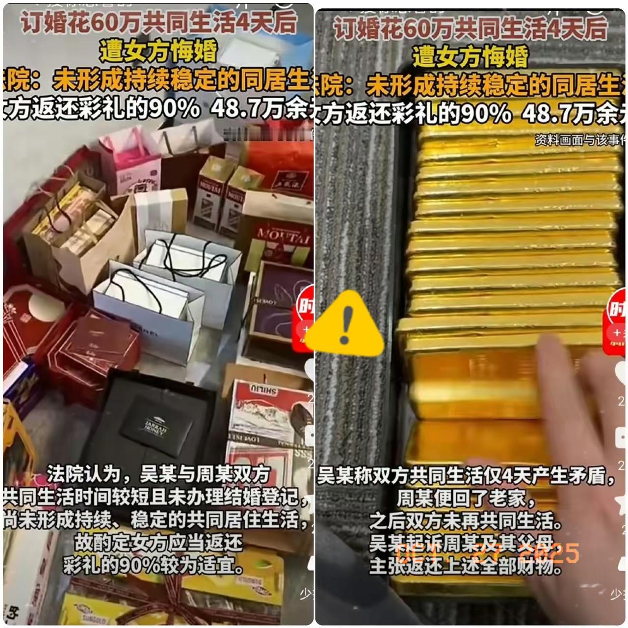 毒贩看了落泪,园区看了心碎! 当代小仙女的赚钱方式! 这“彩礼赚钱法”也太离谱了!江西男子砸60万订婚,俩人只共同生活4天就悔婚,法院判返48.7万,等于一天净赚3万多。 38.8万彩礼+金条戒指全算在内,悔婚却没全退,这哪儿是谈婚论嫁,简直像把婚姻当“短平快套利”的买卖。保护妇女权益没问题,但绝不能成不当得利的空子——真要是鼓励这种操作,只会让大家更怕结婚,结婚率再降也不意外。 说到底,彩礼该是心意不是“赌注”,悔婚就该按规矩多退甚至全退才合理。你们觉得彩礼悔婚该怎么退才不伤人?评论区聊~