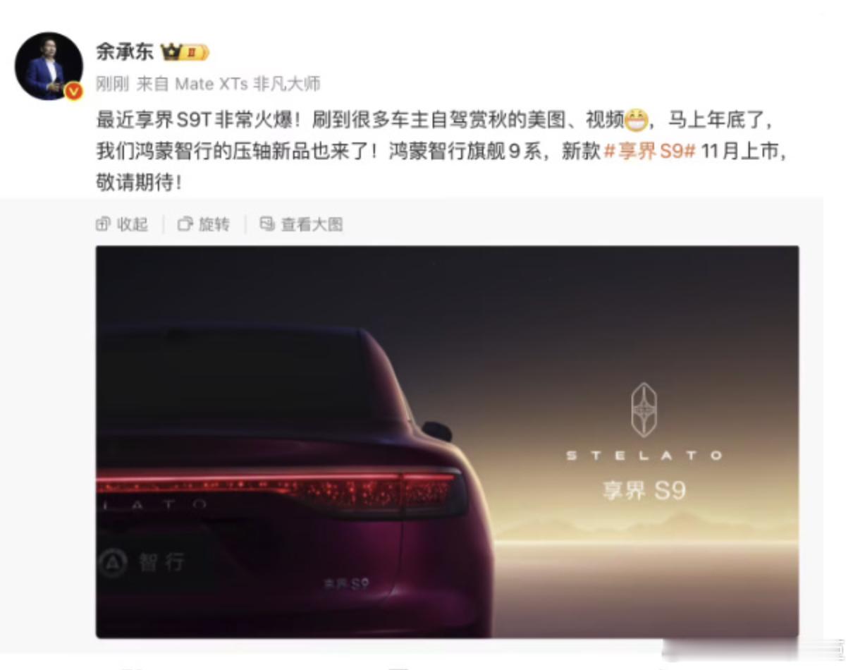 余承东宣布鸿蒙智行压轴新品余承东在微博宣布:鸿蒙智行的“压轴新品”旗舰 9 系 —— 新款享界 S9 将于 11 月上市。