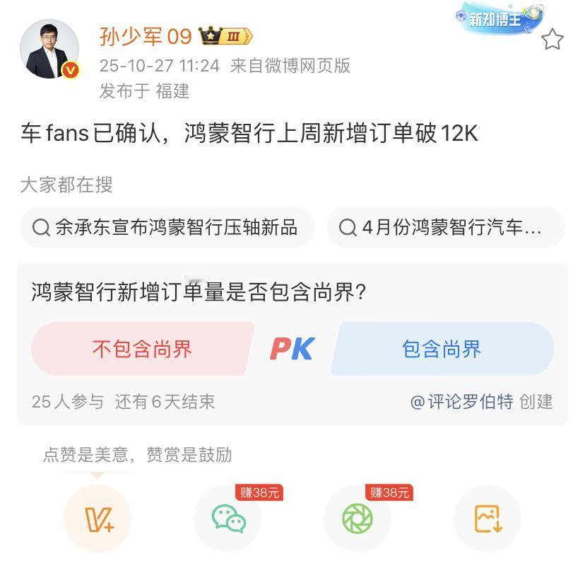 孙少军:鸿蒙智行上周新增订单突破1.2万台! 孙少军统计的数据是不包含华为和上汽合作的尚界品牌,剩下来的4个品牌收获了1.2万台的成绩是相当的不错,不过本周并没有公布尊界的订单情况。 鸿蒙智行车辆销量还想取得一个巨大的进步,从现在看也不太可能,因为没有调价格,接下来也没有新的产品将要上新。