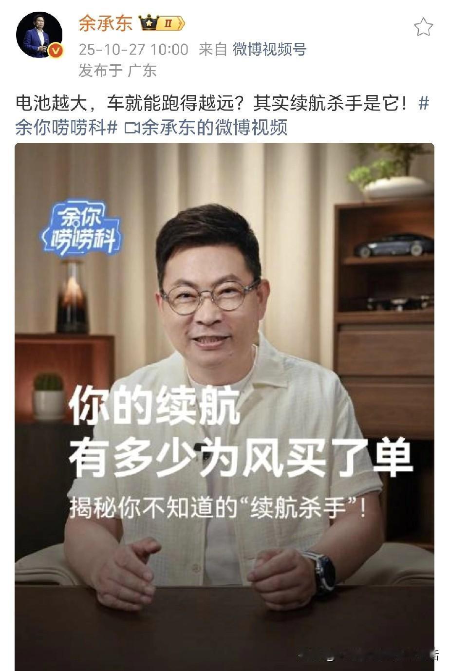 还是雷总接地气! 余总:各种技术科普和使用分享! 雷总:不是卖货就是分享健身打卡!雷总也比较勤快,一天能发好几条动态,还时不时祝大家周末愉快! 快来看,今天余承东发视频又来给大家科普了:风阻才是被我们经常忽略的续航杀手。 万万没想到啊,原来风阻对汽车续航影响这么大! 余总说车速从80增加到120,车速只增加了0.5倍,风阻力线增加到2.25倍。两辆相同电池容量的车,如果风阻系数是0.23的高速,假设能跑500公里的话,那么风阻系数0.27的大概只能跑到420公里,一看就差0.04,却足足多跑了80公里。 我开的是燃油车,虽然没有续航的焦虑,但是我也发现跑高速的时候,车速保持在90码左右跑高速最省油,车速太快,油耗会更大,你们有没有这种感觉呢? 余总在视频里向大家透露了享界S9居然把风阻系数做到了0.193,这是业界中大型豪华轿车中风阻系数最低的。 余总还表示把风阻降下来了后,不止续航更远,风噪也会变小了,给大家带来更加安静舒适的驾乘感受。 也不是吹捧,余总对产品的严格是有口皆碑,在打造鸿蒙智行全系车型时,始终坚持对每处细节反复打磨。要让高能效、高颜值、大空间和低风阻得到完美的平衡,把更极致的用户体验带给大家。华为要是亲自下场造车,估计没有其他车企什么事儿了,其实冷静下来思考,鸿蒙智行一次次的王炸,就是技术有自信,有底气,更有实力。 你们觉得呢?