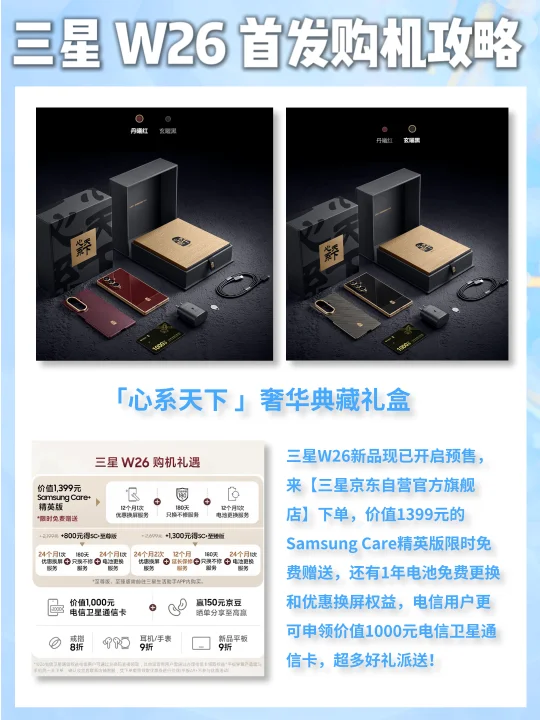 现在预约享价值1399元的Samsung Care精英版限时免费赠送,还有1年电池免费更换和优惠换屏权益,电信用户更可申领价值1000元电信卫星通信卡,超多好礼派送!