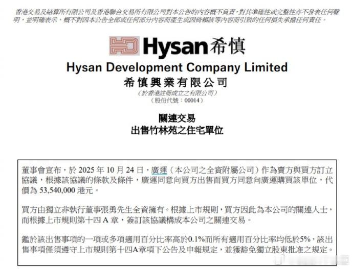 希慎兴业称,买方Verdant Peak Investment Limited是一间于英属维尔京群岛注册成立的有限公司,由公司独立非执行董事张勇全资拥有。该交易初步订金267.7万港元(相当于总价的5%)已于签署该协议时支付,买卖合约拟于11月7日前签署。