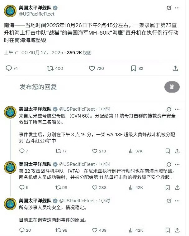 2架美军机在南海相继坠毁鹰酱刷飞机来真的。[哈哈]
