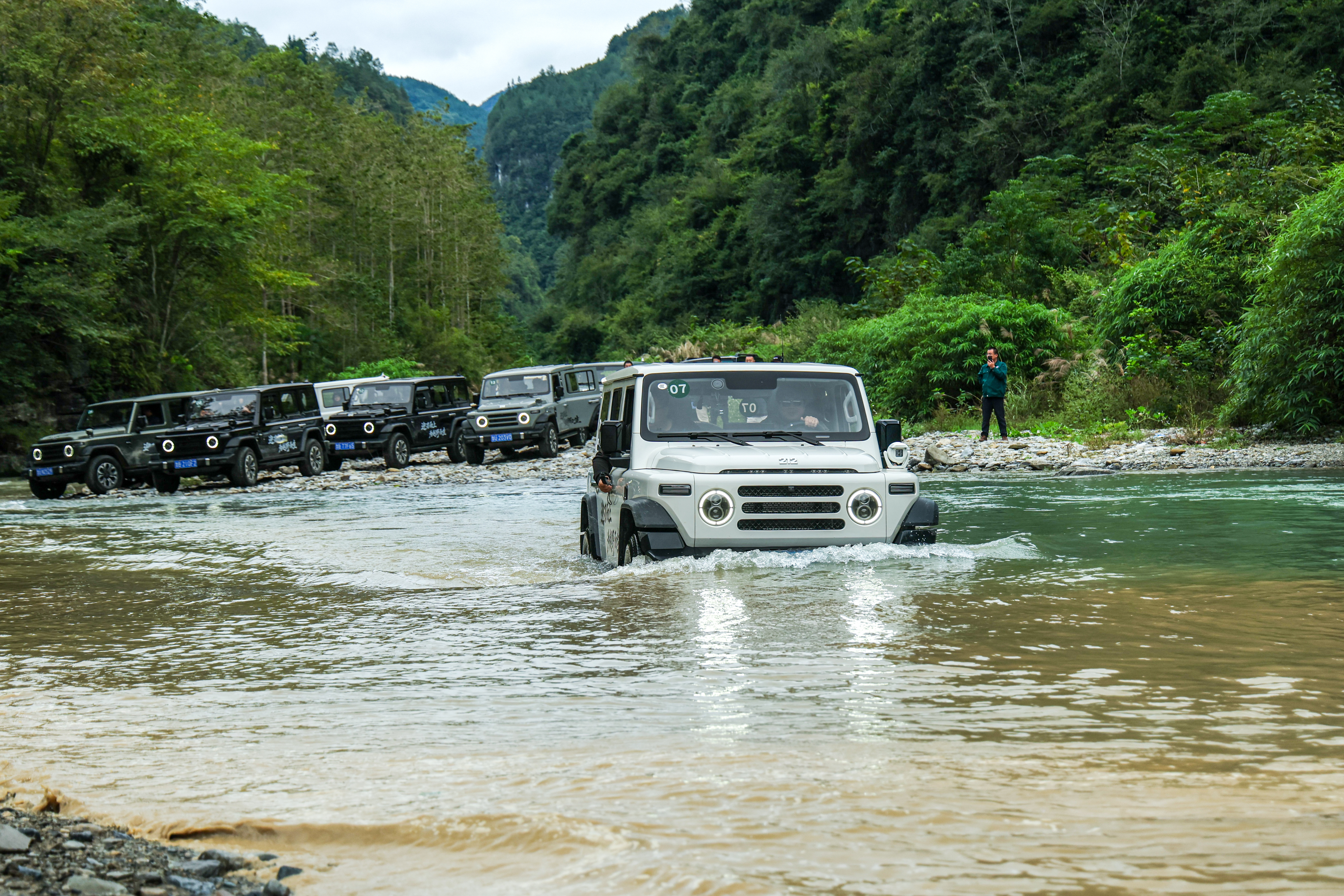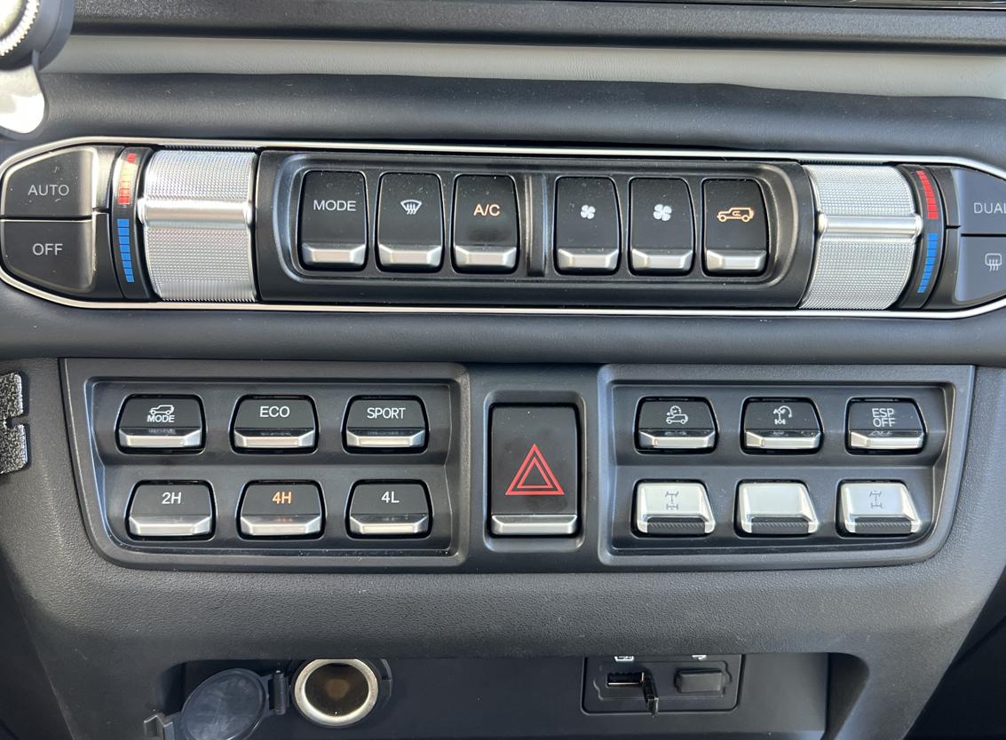采用电控机械分时四驱架构,采用博格华纳分动箱,前后桥能实现50比50的恒定动力分配。挂入4L低速挡,扭矩直接放大2.5倍,升到1025N・m。标配后桥差速锁,可选装前桥差速锁,三把锁加之过千的扭力让越野更为轻松。