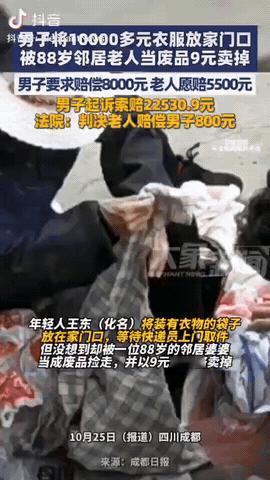四川成都,一男子将价值1万元衣物放在家门口等快递员上门取件,不料,被88岁的邻居阿婆捡走,她误以为是废品并以9元价格卖掉,男子报警后,阿婆和儿媳找到衣服后还给他,但是只愿意赔偿5500元,男子不同意就起诉阿婆,最终法院的判决让人很意外! 信息来源:大象新闻 这件事发生在2025年,王东(化名)是个平常热爱网购的年轻人,习惯把要寄的衣服放在门口,等快递员来收。 他这次放的是几件旧衣物,其中包括一件名贵的始祖鸟冲锋衣,价值不菲。 然而没过多久,他接到快递员的电话,询问衣物的去处,王东这才意识到东西不见了。 经过调查,原来是88岁的张婆婆误以为那是废品,把它们捡走了并以9元的价格卖掉。 王东报警后,物业很快找到了张婆婆。 她和儿媳李芳(化名)火速赶到废品回收站,找回了那几件衣物,并归还给王东。 然而,王东万万没想到,衣物在废品站待了几天,已经有了不同程度的损坏,特别是那件始祖鸟冲锋衣,简直是惨不忍睹。 王东感到非常愤怒,想要张婆婆赔偿8000元,但李芳觉得这个价太离谱了,只愿意赔5500元,结果双方谈不拢。 没办法,王东只好将张婆婆和李芳一起告上法庭,并要求赔偿22,530.9元。 王东认为自己不仅要赔偿财物损失,还要考虑到精神损害和一些误工费。 可是,法院可没那么简单。 经过一番审理,法官最后判定张婆婆确实有过错,但她的行为只是民事侵权,而不是刑事责任。 法庭还指出,王东没有提供足够的证据证明所有衣物的具体价值,最终只是酌情判决张婆婆赔偿800元。 你没听错,800元!王东心中的不满可想而知。 随后的9月26日,李芳通过微信把这800元赔偿转给了王东,事情就这样告一段落。 此案件迅速引发了公众的关注,讨论的焦点围绕着举证责任的问题和高龄侵权人的法律责任。 大家纷纷表示,王东的诉求看似合理,但法律对证据链的要求也不容忽视。 原本是个小区邻里之间的误会,结果却闹得沸沸扬扬,让人感叹这年头,连邻里关系都变得如此复杂。 总的来说,这个事件不仅让我们看到了法律的冷静和无情,更让我们反思邻里之间的情感与信任。 通过这个事给大家提个醒:大家要多留个心眼,不要随便捡人家的东西,你以为是废品,可能是人家还要的东西,不然惹上官司就麻烦了,可以多问一下,如果是别人不要的废品再捡,这样就可以避免一些不必要的纠纷。 还有大家不要把贵重的东西和旧物品放在家门口,如果不见了自己也心疼,否则吃亏的还是自己。