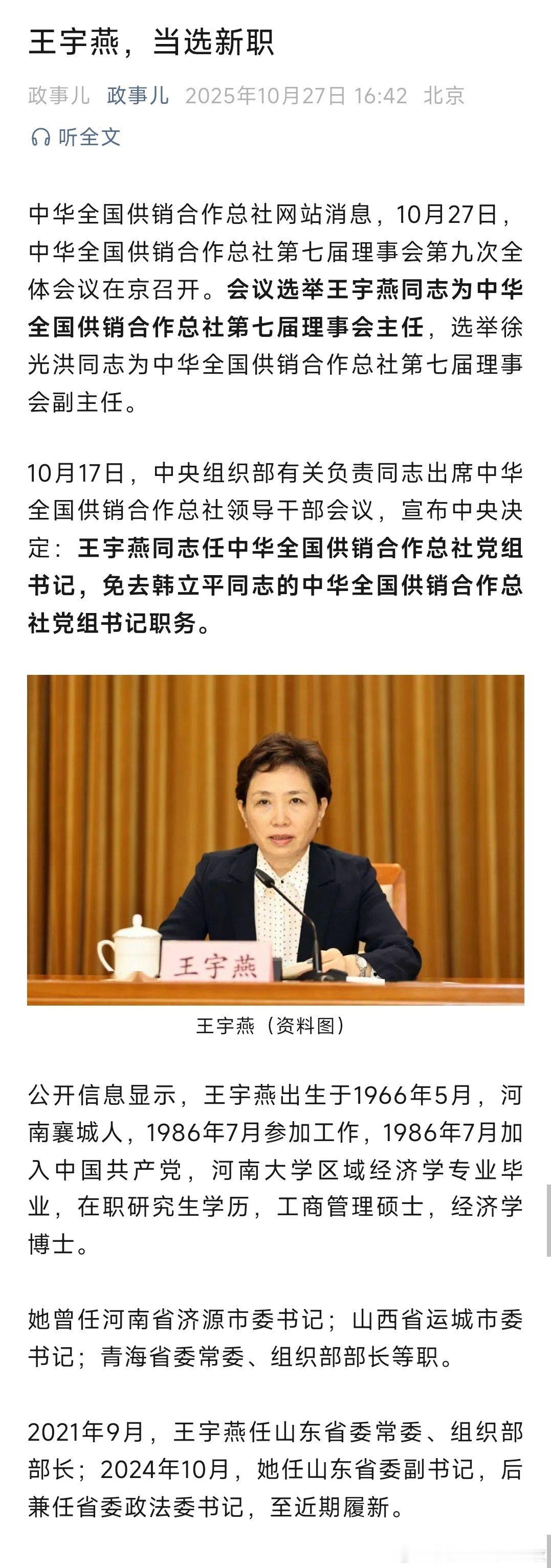 王宇燕任中华全国供销合作总社理事会主任。热点现场