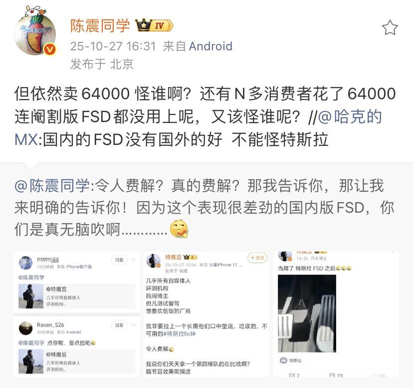 网友:国内的fsd没有国外好,这不能怪特斯拉! 陈震:但依然卖64000 怪谁啊?还有N多消费者花了64000连阉割版FSD都没用上呢,又该怪谁呢? 特斯拉最离谱的事情是这款产品还没有在国内上市的时候就已经在国内销售价值64,000元的FSD了,有的人车都卖了都没有使用上。 现在国内可以使用上了FSD但是效果奇烂也是事实,为什么还有这么多人自愿去维护特斯拉呢? 各位是怎么看的?欢迎评论区留言。