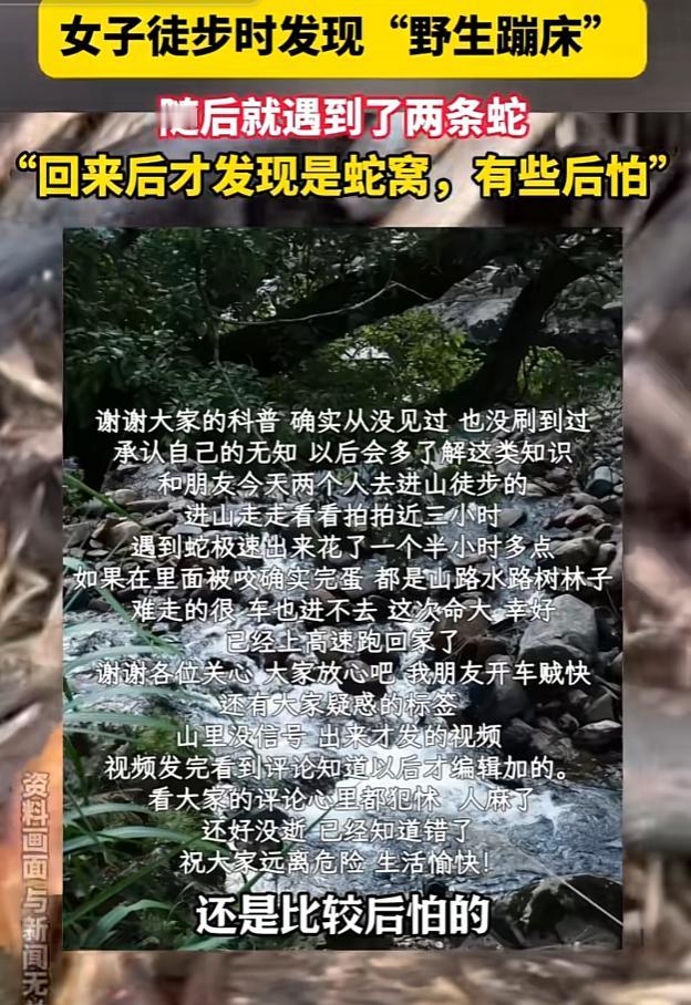 最危险的情况还是发生了!江西一女子在野外徒步时发现,有一段路软软的,好像蹦床一样很有弹性,女子就在上面蹦蹦跳跳的拍了视频,没想到是,这个蹦床其实是蛇窝,而且是有剧毒的眼镜蛇的蛇窝。 当时女子跳的时候只觉得大自然很神奇,居然还有像蹦床一样的土,就上去蹦蹦跳跳,没想到蹦完之后就遇到了两条蛇,幸好并没有袭击女子,只是在原地默默的注视女子走远。 后来女子把视频发到了网上,想跟网友们分享自己的奇遇,没想到网友们隔着屏幕都被吓坏了,原来,这个野生蹦床根本不是自然器官,而是眼镜王蛇的蛇窝。 网友分析说,只有眼镜王蛇会用枯叶做窝,而且眼镜王蛇是群居的,一窝里面可能会有十几条蛇,并且它们的毒性都很强,人一旦被咬,半个小时不注射血清的死亡率是90%,两小时不注射是百分之百。 有经验丰富的网友说,野外如果遇到枯叶成堆,凸起隆起等情况,十有八九就是眼镜王蛇窝,从女子的视频里看,里面估计得有一条两米以上的眼镜王蛇,女子能捡回一条命已经很幸运了。 看到网友的视频后女子也一阵后怕,当时山上遇到了两条蛇应该就是眼镜王蛇,幸好现在是秋天,蛇要冬眠了,不想出来,要不然女子可能就有危险了。 女子也说,爬上山用了三个小时,看到蛇之后被吓的一个半小时就跑下山了,而且山上没有信号,如果真的把蛇惹怒了,可能抢救都来不及。 野外有风险,游玩需谨慎,野外的环境估计优美,但也是危机四伏,出游的时候身边尽量带个有经验的老手当向导,别因为一时的疏忽酿成大祸啊。 素材来源:南昌晚报