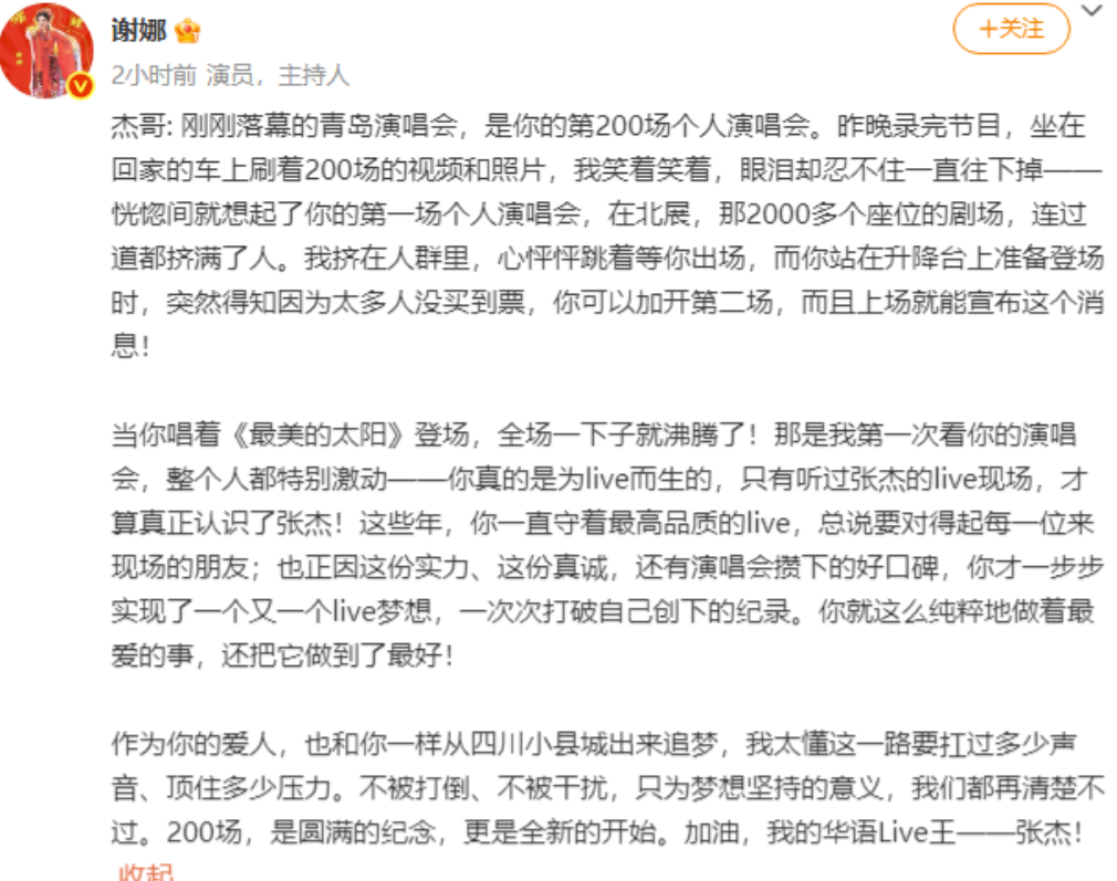近日,张杰结束了自己的第200场个人演唱会,作为他的头号粉丝,谢娜非常激动地表达了对张杰的崇拜和爱慕。她说,她的华语Live王就是张杰。