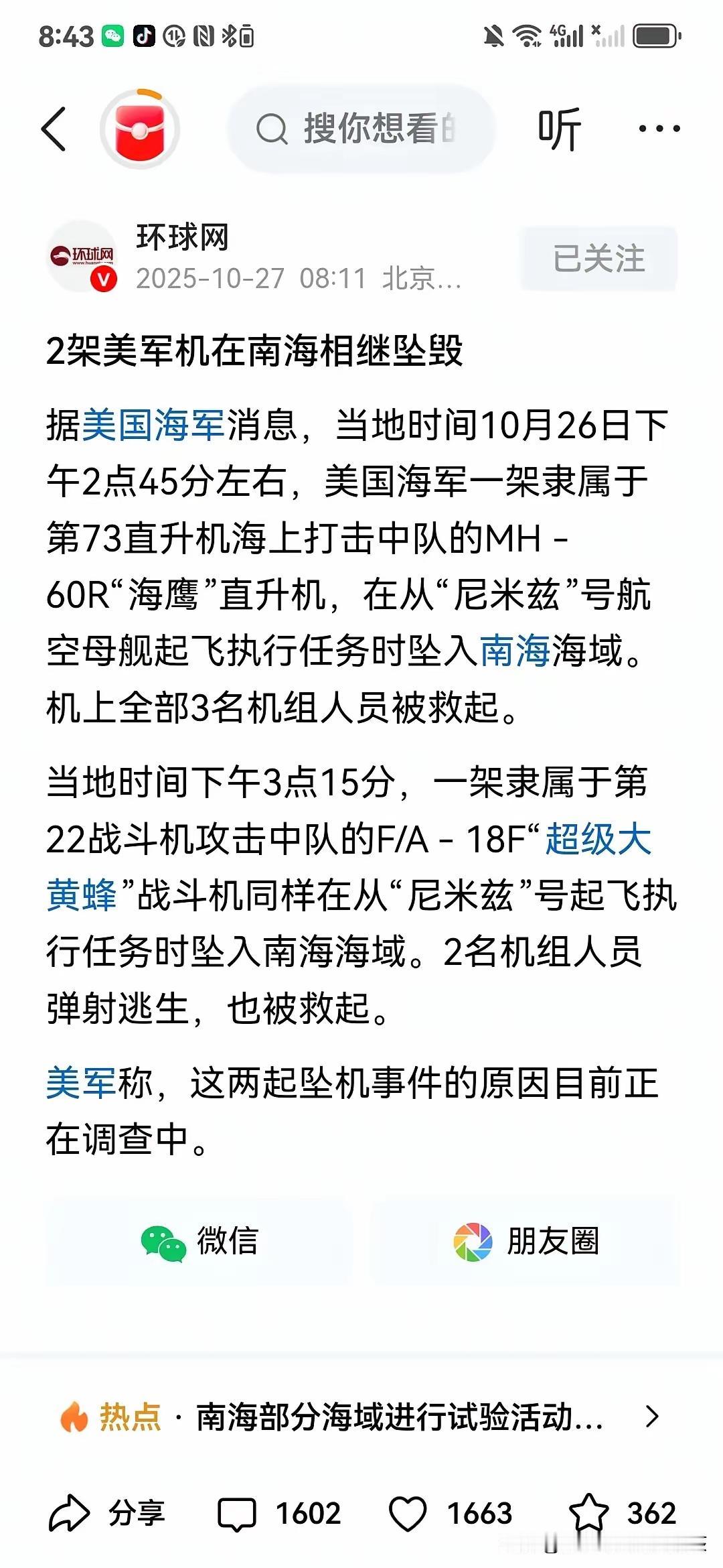 特朗普傻眼了,一个下午竟然有两架美国军机在南海坠毁。还得瑟不? 同样都是从“尼米兹”航母上起飞,两架坠毁飞机起飞时间相隔不到半小时,值得庆幸的是所有飞行员都获救,而一架直升飞机和一架大黄蜂将永远的沉在南海海底。 这系列事故的发生应该与稀土无关,而应与欠饷有某种联系。美国飞行员得不到的,美国政府也别想得到。 网友:政府停摆,飞行员领不到薪水,美国人热爱自由喜欢个性发挥,用摔飞机来发泄情绪,应该是美国大兵的个性吧。 美国飞行员得不到的,美国政府也别想得到。这系列事故的发生应与欠饷有某种联系,而应该与稀土无关。 你们要来南海展示你们的武器,问过南海之主了吗?连这点尊重都没有,那就不能怪南海观音菩萨不给面子啰。 特郎普心里要有多难受,他刚到亚洲马来西亚,派航母到南海为他打气,壮腰,但出师不利,一块摔海里两架,这不是打他的脸吗?
