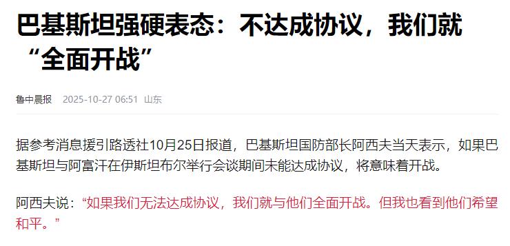 谈不拢就全面开战!巴基斯坦国防部长发出最强硬警告! 10月11日深夜到12日凌晨,巴基斯坦和阿富汗在边境地区爆发了大规模的交火。巴基斯坦军方称,这次冲突是因为“巴基斯坦塔利班”武装分子从阿富汗境内发动了袭击,他们不得不进行反击。 在这次交火中,巴基斯坦方面有23名安全部队人员死亡,29人受伤,而他们声称打死了超过200名武装分子。不仅如此,巴基斯坦还对阿富汗境内的一些军事目标进行了打击,摧毁了多个阿富汗军队的营地和哨所,甚至短暂占领了21个阿富汗的哨所阵地。 阿富汗方面当然也不会坐视不管。阿富汗政府发言人穆贾希德回应称,他们是在对巴基斯坦的“挑衅行为”进行反击,并且在战斗中取得了一定的战果。他说,巴基斯坦有58人死亡,30人受伤,而阿富汗方面只有9人死亡,16人受伤。双方各执一词,冲突的规模和激烈程度不断升级。 其实,这已经不是两国第一次发生边境冲突了。近年来,巴基斯坦和阿富汗之间的边境冲突时有发生,但这次的规模和激烈程度明显超过了以往。这背后到底隐藏着什么样的原因呢? 巴基斯坦方面认为,阿富汗境内存在着大量针对巴基斯坦的恐怖组织据点,这些恐怖组织经常从阿富汗境内发动袭击,给巴基斯坦的安全带来了严重威胁。 其中,“巴基斯坦塔利班”是最主要的威胁之一。这个组织长期在巴基斯坦境内制造恐怖袭击,造成了大量的人员伤亡和财产损失。巴基斯坦政府多次要求阿富汗塔利班政权采取行动,清除这些恐怖组织据点,但一直没有得到有效的回应。 阿富汗方面则对巴基斯坦的指责予以否认。他们认为,巴基斯坦是在借反恐之名,行侵犯阿富汗主权之实。阿富汗塔利班政权多次表示,他们不会允许任何势力利用阿富汗的领土来威胁其他国家的安全,但同时也强调,巴基斯坦应该通过和平谈判的方式来解决问题,而不是采取军事行动。 除了安全威胁之外,两国之间还存在着历史遗留问题。其中,最主要的就是“杜兰线”问题。“杜兰线”是19世纪末英国殖民者划定的巴基斯坦和阿富汗之间的边境线,全长2000多公里。 这条边境线把阿富汗最大的民族普什图族一分为二,导致巴基斯坦境内的普什图人数量超过了阿富汗境内的普什图人。因此,阿富汗一直不承认“杜兰线”的合法性,这也成为了两国之间的一个长期争议点。 根据停火协议,双方重申致力于和平、相互尊重以及保持牢固和建设性的睦邻关系。两国承诺通过对话解决争端,不得对彼此采取敌对行动。同时,双方还商定在10月25日于土耳其伊斯坦布尔再次会晤,商讨落实停火协议及加强安全合作的具体机制。 停火协议的达成给和平带来了一丝曙光,国际社会也对此表示欢迎。中国外交部发言人林剑在10月16日的例行记者会上表示,中方注意到巴基斯坦和阿富汗决定实施临时停火,并将通过建设性对话寻找解决方案,这符合双方共同利益,有利于地区和平稳定。中方对此表示欢迎和支持,并愿意继续为巴阿关系的改善和发展发挥建设性作用。 然而,停火协议的达成并不意味着问题的彻底解决。10月25日,巴基斯坦和阿富汗的谈判代表在土耳其伊斯坦布尔举行了会谈,商讨落实停火协议及加强安全合作的具体机制。 这次会谈对于两国关系的走向至关重要,如果能够达成具体的协议,那么两国之间的局势可能会得到进一步的缓和;如果谈崩了,那么两国之间可能会再次陷入冲突,甚至有可能爆发全面战争。 在会谈之前,巴基斯坦国防部长阿西夫发出了最强硬的警告,他表示,如果会谈未能达成协议,将意味着开战。这显然是巴基斯坦在向阿富汗施压,希望通过极限施压的策略,迫使阿富汗塔利班政权在跨境反恐问题上采取切实行动。 中国作为巴基斯坦的友好邻邦,一直密切关注着局势的发展。中国外交部发言人多次表示,中方支持两国保持冷静克制,实现全面持久停火,坚持通过对话协商妥处分歧,回到政治解决的轨道上来,共同维护两国和本地区的和平稳定。中方愿意继续为巴阿关系的改善和发展发挥建设性作用。 俄罗斯也呼吁两国通过和平方式解决争端。俄罗斯外交部表示,俄罗斯和美国代表在土耳其伊斯坦布尔的磋商是富有成效的、务实的,双方约定继续通过该渠道对话。俄罗斯希望巴基斯坦和阿富汗能够借鉴这种对话方式,通过和平谈判来解决彼此之间的分歧。 美国则表示,将继续关注局势的发展,并呼吁两国保持克制。美国国务院发言人表示,美国支持卡塔尔和土耳其在调解巴阿冲突中发挥的作用,并希望两国能够通过对话解决争端,避免局势进一步升级。 目前,巴基斯坦和阿富汗的谈判仍在进行中,双方能否达成具体的协议还不得而知。然而,从目前的情况来看,两国之间的矛盾和分歧依然存在,和平之路依然漫长。国际社会的支持和调解对于两国的和平进程也至关重要。