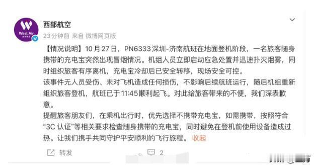 还好飞机没有起飞[捂脸] 西部航空回应旅客充电宝突然冒烟:无人员受伤、航班已