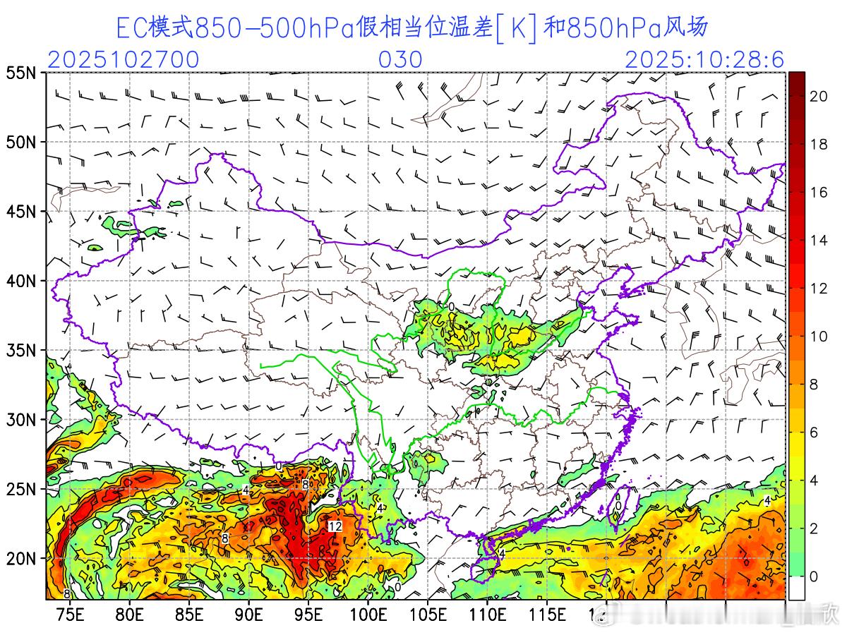【对流】数值预报给出明天在山西南部、河南北部、山东西部等地,可能出现对流降水。从要素预报看,对流能量不明显,但850百帕和500百帕的假相当位温存在正的差值,因此可能出现高架雷暴。与夏季常见的对流相比,这个对流不是从近地面发展起来,而是从850百帕或更高层面发展起来,因此称为高架雷暴。