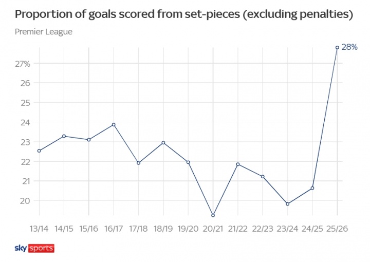 以往的几个赛季,英超定位球破门占比往往在20%-23%左右徘徊,而本赛季9轮战罢,这一数字来到28%,远远高于过往赛季。