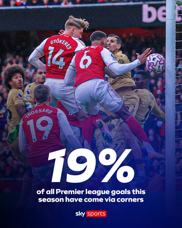 据天空体育统计,本赛季英超目前241粒进球中,有45个来自角球,占比高达19%,这个数字创下了英超联赛历史上的最高比例。