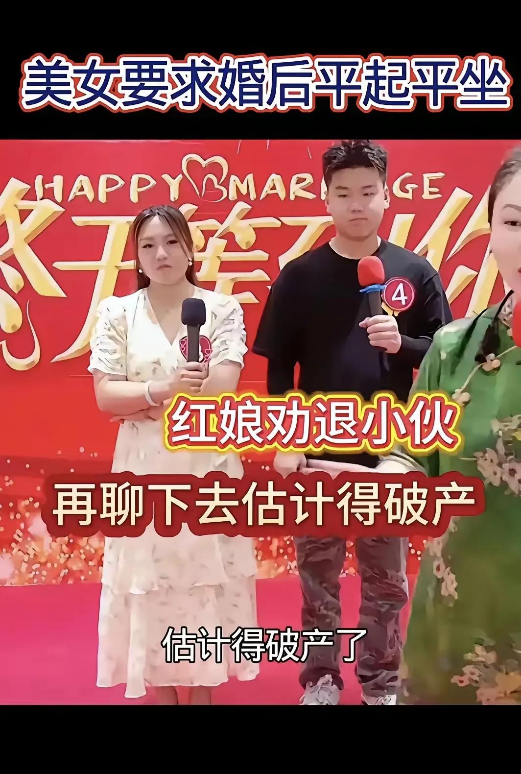 小仙女果然非同凡响[捂脸] 得知男士有一家公司,当即表示,以后对方财产要上交,公司账户得自己管理。连红娘都让男士赶紧逃。[笑哭]不得不说,口气和勇气都不小啊。 我真的有些奇怪哈?为什么那么多女性会提这种要求?你们真当别人傻吗?倒也是,苏享茂,李哨兵…的案例,给了太多人自己也能捞一笔的幻觉。 也难怪越来越多男人选择独自一人保平安,至少没有倾家荡产的风险。 那些相亲奇葩事 小仙女