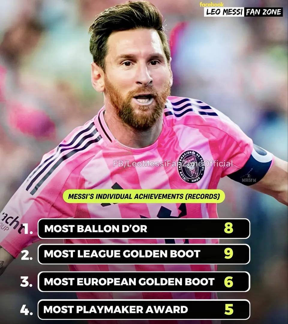 最多的金球奖,8座。 最多的联赛金靴奖,9座。 最多的欧洲金靴奖,6座。 最多的中场最佳组织者奖,5座。 最多的国际足联最佳球员奖,3座。 这就是梅西。 有踢出来的,有评出来的;有前锋的,有中场的;有足联发的,有媒体发的。