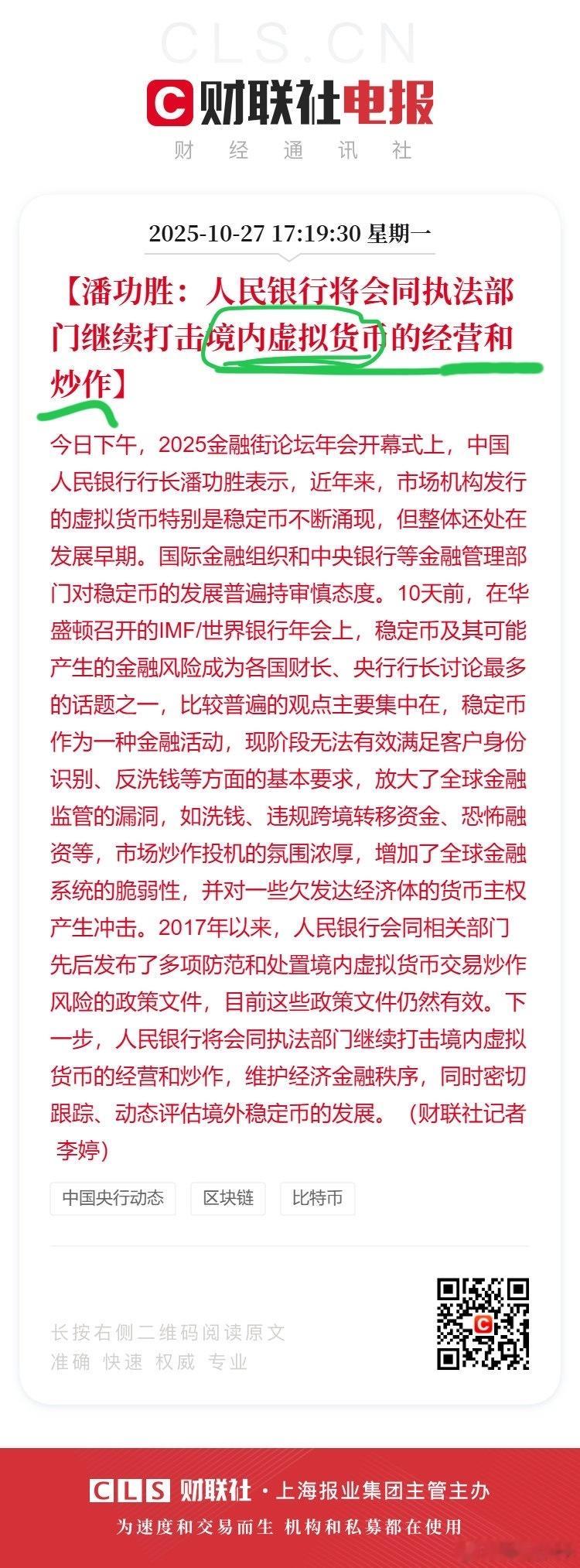 【潘功胜:人民银行将会同执法部门继续打击境内虚拟货币的经营和炒作】