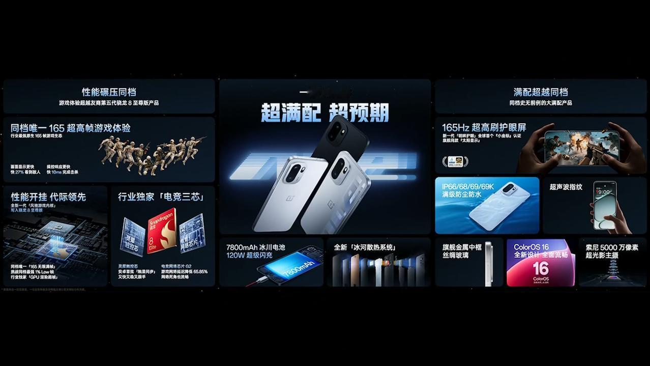 一加 Ace 6 价格来了,12+256GB 售价 2599 元、16+256GB 售价 2899 元、12+512GB 售价 3099 元、16+512GB 售价 3399 元、16GB+1TB 售价 3899 元。内存涨价确实很厉害。。[吃瓜群众] - 芯片:骁龙 8 至尊版移动处理平台,LPDDR5X Ultra 内存(9600Mbps),UFS 4.1 闪存,全新风驰游戏内核,冰河散热系统(大平层冰河 VC),自研电竞网络芯片 G2、灵犀触控芯,自研 Display P3 屏幕芯片; - 屏幕:6.83 英寸 2800×1272 OLED 直屏,支持 165Hz 刷新率(LTPS,1-120Hz 自适应刷新),330Hz 五指采样率,290Hz 十指采样率,3200Hz 瞬时触控采样率,支持全亮度 DC 调光+PWM 调光,超声波指纹识别,支持湿手触控; - 相机:前置 16MP(索尼 IMX480),后置 50MP 主摄(索尼 IMX906,OIS,1/1.56")+ 8MP 超广角(索尼 IMX355)双摄; - 续航:7800mAh 冰川电池(含硅量 15%),120W 快充,43 分钟充电 100%,支持旁路充电; - 其他:厚 8.3mm,重 213g,闪银、亮白、竞黑 3 款配色,玻璃后盖,铝合金金属中框,支持 Wi-Fi 7、蓝牙 5.4、NFC、红外遥控,超线性立体声双扬声器,游戏手柄级陀螺仪(200Hz 采样率),IP66 & IP68 & IP69 & IP69K 防尘防水,搭载基于 Android 16 的 ColorOS 16 系统。