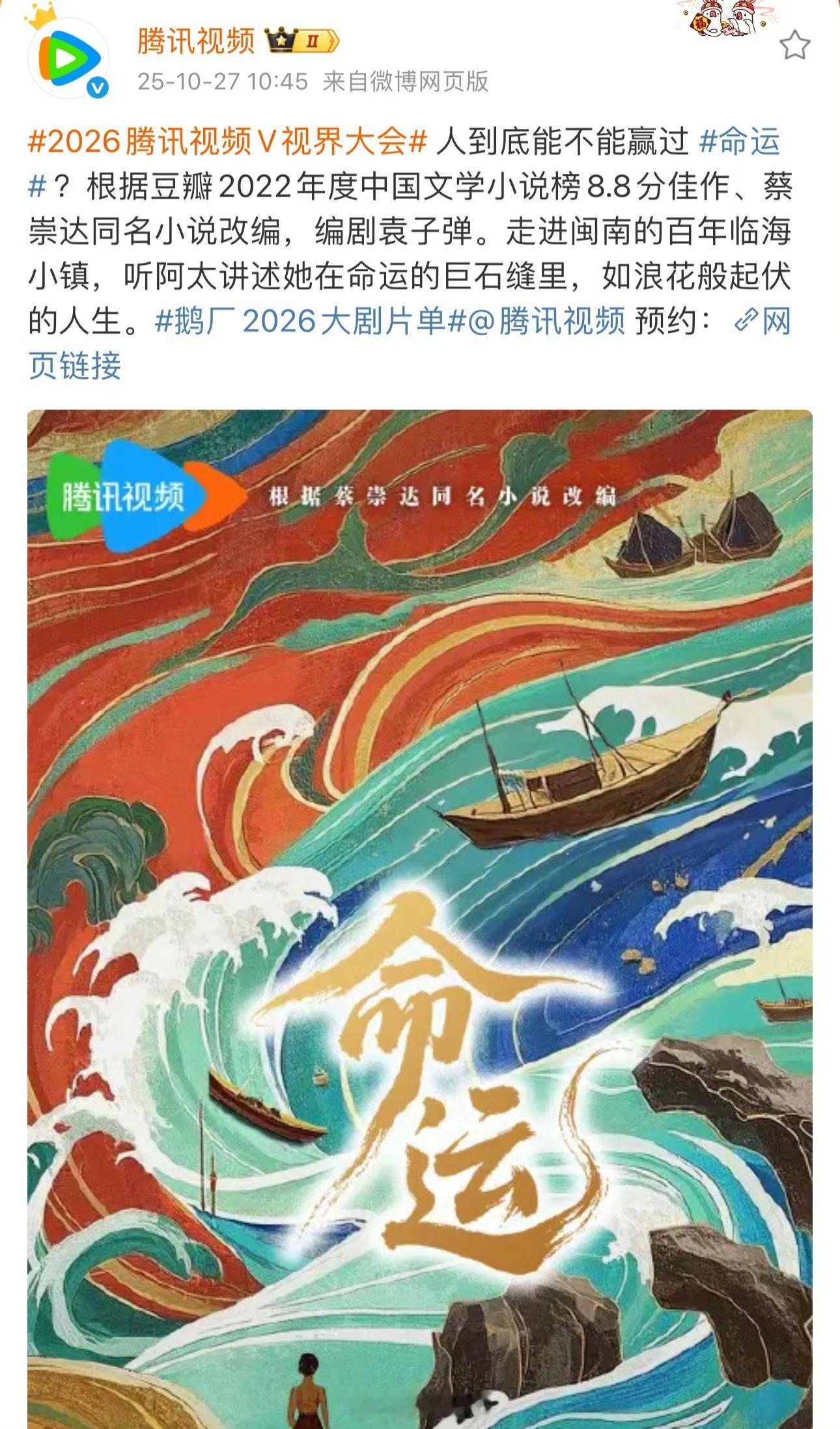 最新消息,辛芷蕾下一部戏是蔡崇达的小说改编的电视剧《命运》这是拿奖之前定好的。