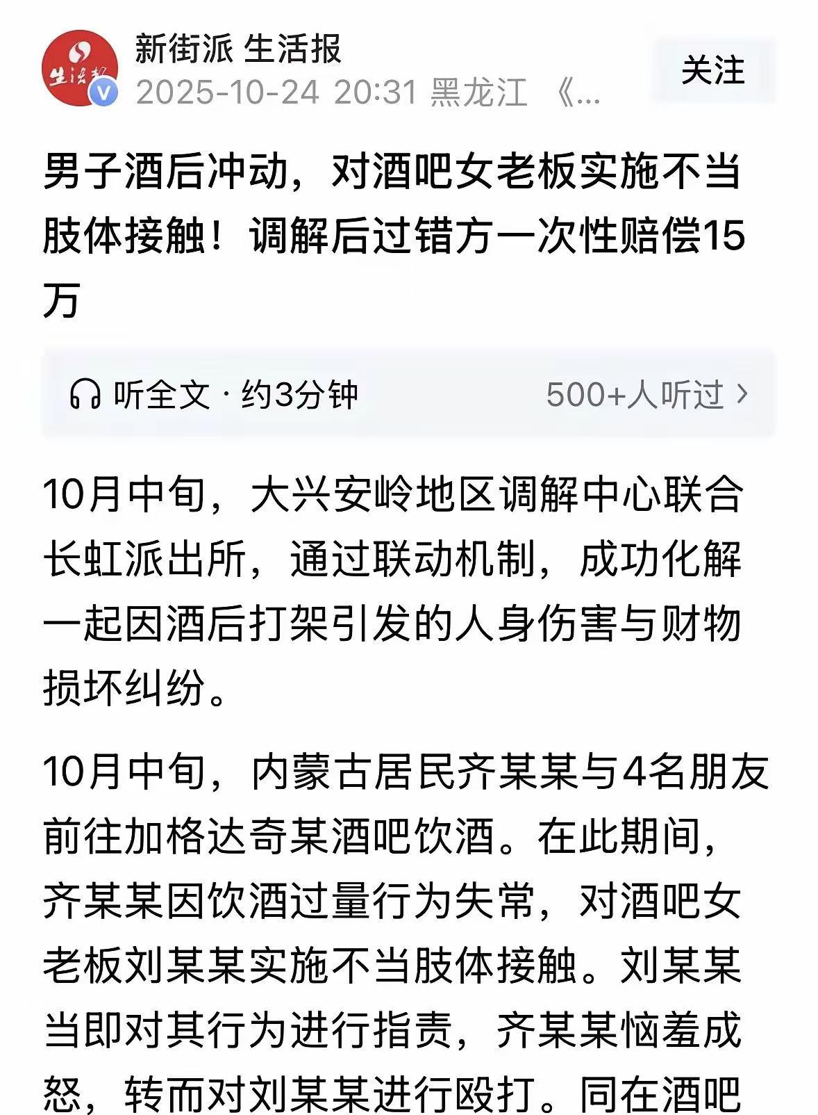 内蒙古,一男子和4个朋友在酒吧喝酒,然后他喝上头后,发现老板娘长得漂亮,就凑近对着她动手动脚,老板娘就斥责男子这种行为,没想到男子就直接殴打老板娘,另外2名男顾客看不下去了,上来将男子拉开,男子4个朋友却误以为2人是在挑衅,他们冲上来就对着2人和老板娘一顿打,然后酒吧场面一片狼藉,最终报警后,男子和四位朋友的结局出乎意料。 信息来源:新街派 生活报 事情发生在2025年的一个晚上,齐某某和他的四个朋友在酒吧里大喝特喝,酒水下肚后,大家的情绪都高涨得不得了。 齐某某东张西望,眼神飘忽不定,看到酒吧的女老板刘某某长得漂亮,心里一阵痒痒,借着酒劲就朝她凑了过去,把手伸了上去。 刘某某正在忙着招呼客人,突然被骚扰,立即反应过来,不由分说就大声斥责齐某某,试图让他停下这种不当行为。 可齐某某听了这话,心里很不爽,觉得面子受到了损害,便直接就动起手来,朝刘某某打了过去。 这下可闹大了,正好旁边的顾客顾某某和吕某某看到这一幕,立刻冲上去想要拉开齐某某,想要制止这个无耻的行为。 可齐某某的四个朋友见到自己的兄弟被“欺负”,立刻以为是这两个顾客在挑衅,毫不犹豫地也加入了混战。 一瞬间,酒吧里的气氛变得异常火爆,打斗声、尖叫声混杂在一起,没几分钟,酒吧里的桌椅都被砸得稀巴烂,酒水洒得到处都是,场面一片狼藉,简直难以置信。 就在这个时候,警方接到报警,迅速赶到现场,将这个醉酒闹事的团伙控制住,经过调查,齐某某和他的朋友们因为寻衅滋事、殴打他人、故意损毁财物等违法行为,全部被依法行政拘留,并处以罚款。 最终,齐某某等人和酒吧达成了赔偿协议,总共赔偿了15万元,用于刘某某的医疗费用和酒吧的财产损失。 从法律的角度来看,齐某某的行为毫无疑问构成了性骚扰和故意伤害,情节相当严重,因此他要承担主要责任。 而他的四个朋友,虽然是因为误解情况参与斗殴,但也同样构成了寻衅滋事,理应受到惩罚。 这15万元的赔偿虽然看似解决了问题,但并不代表他们可以逃脱法律的制裁。 这件事情在网上引发了很多讨论,大家都对酒后滋事和性骚扰表示强烈反对,并呼吁酒吧等娱乐场所加强安全管理,保护每一位顾客的权益。 警方也借此机会提醒大家,饮酒要适量,不要因为酒后失态影响自己和他人的安全。 如果大家遇到骚扰或其他违法行为,一定要及时报警,避免事情变得更加严重。 这次事件不仅仅是一个酒吧的斗殴事件,更是一堂生动的法律课。 所以,希望大家都能从中吸取教训,要懂得法律意识,不能喝醉酒做犯法的事情,否则后悔莫及。 毕竟,法律面前人人平等,所以不能触犯法律的事情,否则会受到法律的惩罚。