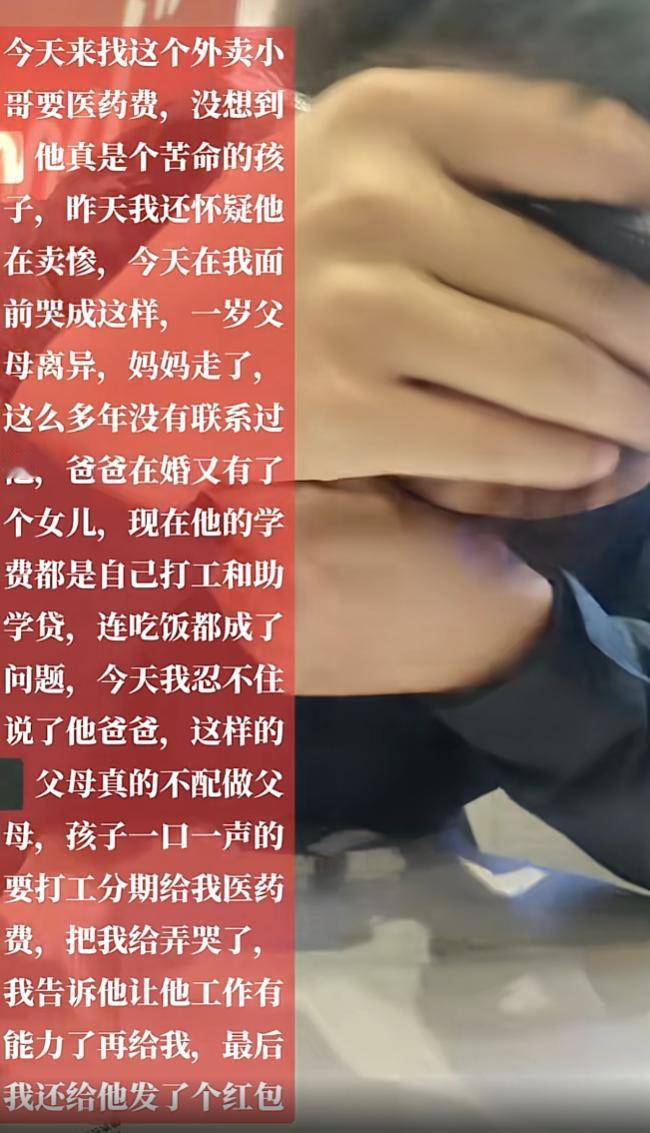 万万没想到!江苏南京,女子三个月前被外卖小哥撞伤,撞伤后外卖小哥逃逸,三个月后女子跟警察找到了小哥的家里,结果不仅没有要赔偿,还给他包了一个大红包,叮嘱小哥好好生活。网友:这是真善人。 三个月前,女子被外卖小哥撞的肋骨骨折,没想到外卖员见撞到人直接跑了,三个月里不仅没付医药费,还把女子电话给拉黑了,女子只能报案,警察同志给外卖员打电话时,外卖员说,自己父母离婚了没人管,从小是爷爷奶奶带大的,实在是没钱赔偿了。 一开始女子只是以为他在卖惨,便跟警察同志去了外卖员中的村子里找他,可是没有找到,只从村民的口中得知,外卖员的父母真的离婚了,生活确实比较拮据,女子想着算了,治病的钱就当做股票亏了,吃下这个哑巴亏。 没想到第二天的时候再去时候,又找到了这名外卖小哥,一番了解之下才知道,之前电话说的不是卖惨,小哥一岁的时候父母离异,妈妈改嫁了,爸爸再婚有了女儿,对这个大儿子也不管了,这些年的学费都是自己打工攒的加上助学贷款,平时跟爷爷奶奶吃饭都是问题。 再把女子撞伤之后,小哥也非常后悔,一直想跟女子说声对不起,把欠女子的医药费还上,只是实在拿不出钱来了,小哥答应女子,现在正在打工,等发工资之后,会分期把欠女子的医药费还上。 小哥一边说着过去的经历,一边抹着眼泪,女子也被小哥过去的经历打动,跟小哥一起骂了他爸爸一顿。 女子对小哥说,医药费不着急,等你有了稳定工作之后再给我也不迟,走之前还给小哥包了个红包,让小哥回去给爷爷奶奶买点吃的,让爷爷奶奶少受点苦 女子把自己和小哥的经历发到网上后,引起了不少网友的点赞和转发。 有的网友说,一个善意能让好人变得更好 也能让一个即将误入歧途的人 向正道迈入一点。 也有的网友说,这个小孩也算努力啊,其实他撞了你他压力应该也很大,无论从心理上经济上,小时候做错事了觉得心里很慌,更何况你这个是大事,小孩也很可怜。 女子也说,自己孩子跟小哥同龄,看到小哥也想起了自己孩子,遇到了就不能不管。 看了视频,女子真是一个大好人,女子自己的生活也不容易,本来是对方的问题,可是女子看他可怜,不仅没有要医药费,还给包了个红包,给小哥的生活送了一份实实在在的温暖。 虽然小哥可怜,但还是要说小哥一句,即便是身上没钱,也不应该逃避,早点把问题说清,也不会造成这样的误会。 最后,要狠狠骂小哥的父母,追求自己的幸福没有错,可是把孩子扔下不管就是错,爸爸再婚只要女儿,妈妈改嫁远走高飞,现在孩子连个联系方式都没有,只能跟着年迈的爷爷奶奶生活,靠送外面跟贷款维持上学和生活,这样的父母真的不配做人。 女子的善举不仅仅是一个红包,更是给了小哥一份爱和希望,让小哥知道,除了爷爷奶奶,还有更多的人关心自己,那句以后找到工作再还,给小哥心里也种下了颗种子,让小哥继续朝着目标前进。 希望女子和小哥的生活都能越来越好,这份善心永远不被辜负。