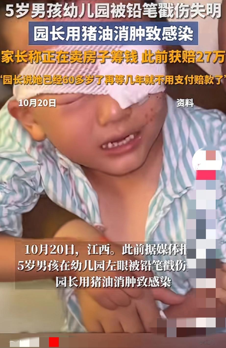 小宇的左眼,被一支铅笔刺伤了。真让人揪心。 江西瑞昌五岁男童的遭遇,让人难过,谁都没想到,铅笔戳进了眼睛,太可怕了。 伤口涂了猪油,当班老师干的,这谁能想到,结果更严重了,感染,小宇的左眼,彻底失明了,以后要带义眼,想想都难受,孩子还那么小。 老师说给了27万治疗费,也快60岁了,过了60岁之后就不管了,这哪行,后续费用怎么办。 幼儿园安全意识那么差,应急处理也不行,只想着赚钱,良心呢,社会责任感呢。