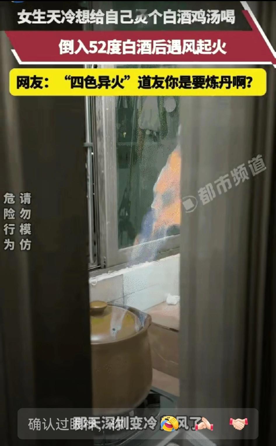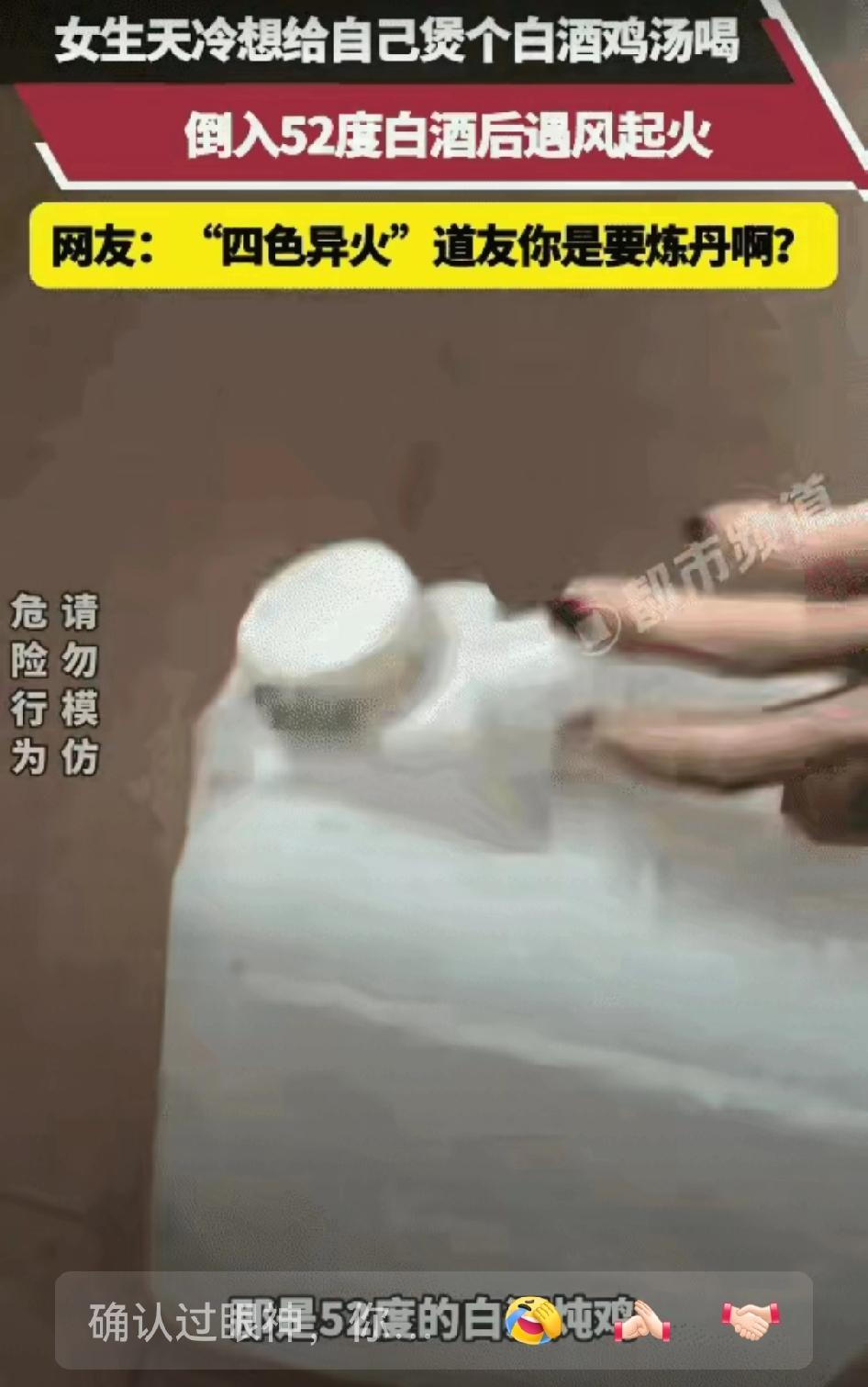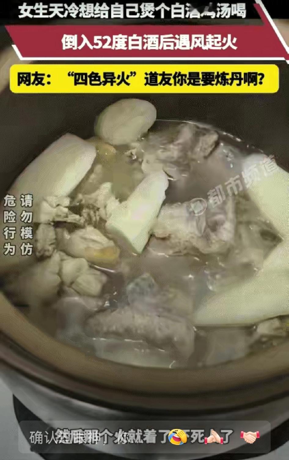 笑不活了! 广东一女子用52度白酒煲鸡汤,没想到窗外一阵风把酒吹得飘了出去,瞬间点着了,火焰一下窜起半米高,把她吓得差点把酒瓶扔出去。 据悉,当时这位女子正在厨房里煲鸡汤,先是放入了整只鸡,又倒了一些52度的白酒去提味,她边做边聊,还拿起酒瓶给镜头做个“喝一杯”的动作,一副其乐融融的样子。 没想到,这时窗外一阵风把酒吹得飘了出去,正好点着了,火焰一下窜起半米高,把她吓得差点把酒桶扔掉。 女子当即反应过来,赶紧盖上锅盖灭火,把煤气灶往旁边一挪,就把火扑灭了。 视频中的锅里鸡汤焦黑不堪,她无奈发了个“笑哭”的表情发到朋友圈,并配文“我真的是‘炼丹’了”。 评论区网友纷纷调侃“炼丹”了:“下次能不能别‘炼丹’?”“喝一杯?还是别了,怕被‘炼丹’!”“要不你去隔壁老王那边‘炼丹’?” 也有网友提醒道:“高度酒遇到明火容易炸,厨房用火还是要小心点。”说实话,这个女人真是惊险之余好在心细,如果要是大意一点,挪一下煤气灶或者扑灭的时候晚一点,都有可能引发更大的火灾,后果不堪设想。 也提醒大家,在厨房做饭的时候一定要注意安全,尤其是用酒精类调料的时候,一定要谨慎! 对此,您怎么看?