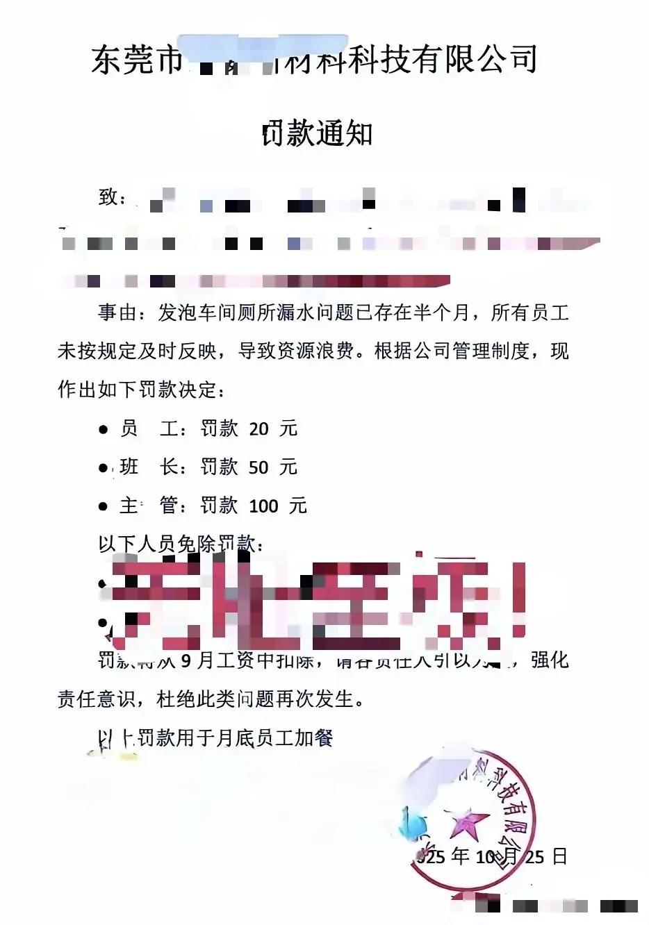 东莞一家公司因发泡车间厕所漏水半月无人反馈,对18名员工罚款(普通员工20元、班长50元、主管100元),罚款将用于员工加餐。管理人员回应称,20元仅为“善意提醒”,重点处罚管理者,未罚行政部门是因厕所少有人巡查,需员工反馈才能发现问题。事件引发热议,本文从法律角度拆解公司罚款合法性,厘清责任边界,带你看懂职场中的“责任认定”争议。 一、事件复盘:厕所漏水半月,18名员工被罚款 最近东莞这家公司的处罚通知,让不少打工人看得一头雾水。 事情是这样的:公司发泡车间的厕所漏水了,而且一漏就是半个月。这半个月里,从普通员工到车间主管、班长,愣是没一个人向公司反馈。直到公司发现后,直接下了处罚通知——18名相关员工全被罚款,普通员工罚20元,班长罚50元,主管罚100元。 更特别的是,通知里还写着,罚款不会进公司账户,而是用来月底给员工加餐。同时,加班修水管的两名员工和一名新员工,因为没责任或有贡献,免予处罚。 面对质疑,公司管理人员觉得很诧异:“没想到这事儿会被发到网上。”她解释说,这个车间的厕所比较偏,行政部门基本不会去,之前修过一次又坏了,必须靠员工反馈才能知道情况。“漏水半个月不是小事,员工漠视肯定要提醒,20元就是个象征,真正要罚的是主管和班长,他们罚款金额更高。” 可员工们却不买账:“修厕所是行政的活,我们只是干活的,漏了水凭啥罚我们?” 二、法律拆解:公司罚款合法吗?这3个关键点要分清 很多打工人都遇到过类似问题:公司动辄罚款,到底合不合法?结合这件事,咱们把法律账算明白: 1. 公司有罚款权吗?分情况! 首先要明确:不是所有公司都能随便罚款。 根据《工资支付暂行规定》,只有两种情况公司能扣除员工工资:一是员工给公司造成了经济损失,可从工资中扣除赔偿,但每月扣除金额不能超过工资的20%,且扣除后工资不能低于当地最低工资标准;二是员工违反公司依法制定的规章制度,且制度里明确了罚款条款,同时该制度已经过工会或职工代表大会讨论通过,并公示告知员工。 这家公司的罚款,若制度合法且公示过,从程序上是合规的;但如果没有明确制度,或制度没经过民主程序,那这个罚款就涉嫌违法。 2. 普通员工该担责吗?责任要匹配! 厕所漏水的核心责任到底在谁?从法律上讲,责任要和岗位职责对应。 - 普通员工的职责是完成生产任务,反馈厕所漏水更像是“协助义务”,而非法定义务。公司不能把行政部门的维修责任,转嫁到普通员工身上,让员工为“未反馈”买单,这属于责任划分不清。 - 车间主管和班长则不同,他们负责车间日常管理,包括设施维护的协调反馈,对漏水问题漠视,确实存在失职,处罚他们更符合“责任与处罚对等”原则。 3. 罚款用于员工加餐,就能免责吗?不能! 公司称罚款用于员工加餐,而非盈利,这一操作看似“人性化”,但不能成为违法罚款的借口。 如果罚款本身没有合法依据,哪怕钱最终用在员工身上,也改变不了“非法扣除工资”的性质。员工依然可以向劳动监察部门投诉,要求返还罚款。 三、网友吵翻了:20元虽少,道理要讲清! 事件曝光后,评论区分成了鲜明的两派,吵得不可开交: 反对罚款派:“这就是甩锅!修厕所是行政的活,员工没反馈就要罚钱,那行政部门没主动巡查,为啥不罚?”“20元不多,但心里膈应,公司管理不到位,反而怪员工,太不合理了!” 理解公司派:“漏水半月没人说,员工确实有点漠视,20元就是个提醒,总比不管不问强。”“罚款用于加餐,说明公司不是为了赚钱,就是想强化责任意识,主管罚得更重,也还算合理。” 理性分析派:“关键看公司有没有明确制度,有制度且公示过,程序就合法;没制度就是乱罚款。但普通员工的责任确实有点牵强,更该罚的是行政和管理者。” 结论:职场罚款不是“提醒”那么简单!你怎么看? 这起20元的罚款事件,看似小事,却戳中了很多打工人的痛点:公司到底有权罚员工吗?员工该为不属于自己的责任买单吗? 其实,公司想强化责任意识没错,但更该先厘清责任边界:行政部门的巡查义务、管理者的监管责任、员工的协助义务,不能混为一谈。与其靠罚款“提醒”普通员工,不如完善设施维护流程,让行政部门主动排查隐患,让管理者切实履行职责。 最后想问大家:你在职场中遇到过类似的“奇葩罚款”吗?你觉得这家公司的处罚合理吗?如果是你,会接受这20元的罚款吗?欢迎在评论区聊聊你的经历和看法!