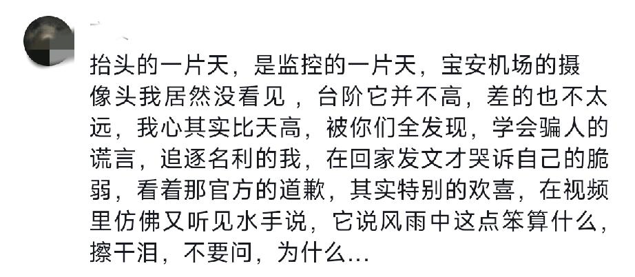 郑智化恐怕怎么也没想到,自己为“连滚带爬”事件诚恳道歉,换来的不是谅解,而是评论区一面倒的谴责。就连他那首鼓舞几代人的成名作《水手》,也被网友迅速“爆改”,成了反讽现场。 为何网友这次如此气愤? 答案全在深圳机场那段监控里: 轮椅小哥全程弯腰护行,小心翼翼; 见他行动不便,主动伸手搀扶他的腿通过狭窄机门; 多名地勤全程协助,服务并无怠慢。 一边享受贴心服务,一边用“连滚带爬”博取同情——这分明是“端起碗来骂娘”。 若不是监控全程记录,这些尽心尽责的工作人员,很可能就要无辜背上“服务不周”的锅,遭遇一场无妄的网络暴力。 他的歌词曾教会我们在风雨中要勇敢,但他的行为却示范了如何把别人的善意当作表演的舞台。作为公众人物,更应珍惜话语权,不能为了渲染情绪,就轻易抹杀他人的付出与尊严。