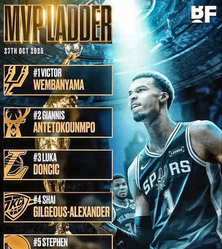 一觉醒来!NBA传来了2个不得不说的重磅消息: 1、NBA官方公布了最新一期球队实力榜: 1到5名分别为雷霆、勇士、掘金、尼克斯、骑士,6到10名分别为湖人、森林狼、马刺、快船、活塞,火箭排名下降到第11名。 马刺第八?离谱!不进前三?勇士第二高了,马刺3-0,勇士实打实的输了开拓者20分。火箭说好的前三战斗力呢?最夸张的是前十里面西部球队占了七席。 2、美媒发布了NBA首周MVP排行榜: 文班亚马榜首,字母哥次席,东契奇第三,SGA第四,库里第五。 约基奇估计把精力留到季后赛,常规赛不太会争MVP了 。