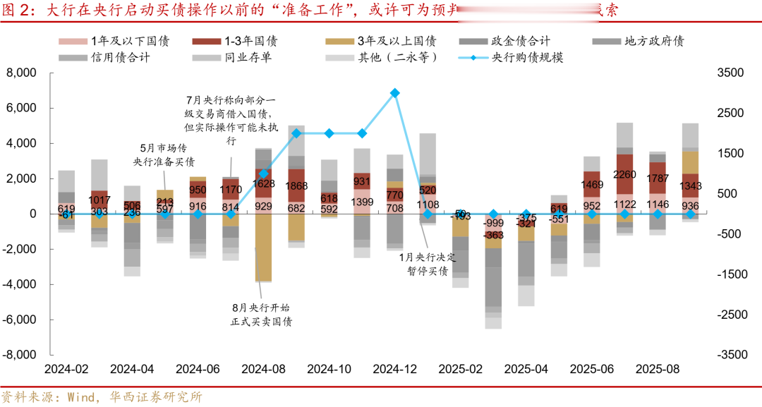 二是如果央行执行买入操作,两轮买债行为有何潜在异同?结合近期大行行为特征,新一轮央行买债,可能会采取短债与中长债组合买入的方式。考虑到央行买债的对手方多为大行,大行在央行启动买债操作之前的“准备工作”,或可为预判央行行为提供一些线索。例如2024年8月央行启动“买短卖长”操作,大行曾在6-7月加力配置1年内及1-3年国债,月均净买入865、1060亿元,明显高于4-5月均值的416、359亿元。今年8月,大行主要增持品种同为1年内、1-3年国债,净买入1146、1787亿元,其余品种累计净卖出602亿元;而9月大行在维持净买入短国债至之余,还提升了对3年及以上国债的配置规模,累计净买入1266亿元(7、8月分别为-450、-24亿元)。说明新一轮央行买债,可能也会涉及3年及以上期限。