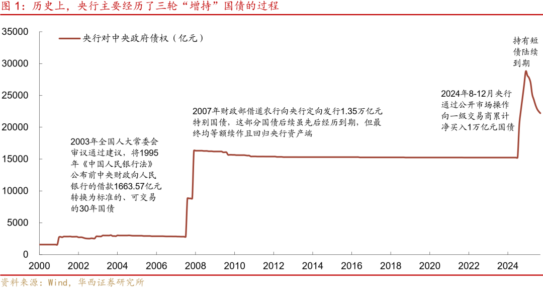 一是央行提及恢复国债买卖操作,究竟是先买债还是先卖债?从实操角度分析,央行“买债”概率或大于“卖债”。历史上,央行主要经历了三轮“增持”国债的过程,第一轮是2003年全国人大常委会审议通过建议,将1995年《中国人民银行法》公布前中央财政向人民银行的借款1663.57亿元转换为标准的、可交易的30年国债(030014);第二轮是2007年财政部借道农行向央行定向发行1.35万亿元特别国债,这部分国债后续虽先后经历到期,但最终均等额续作且重回央行资产端;第三轮是2024年8-12月央行通过公开市场操作向一级交易商累计净买入1万亿元国债。