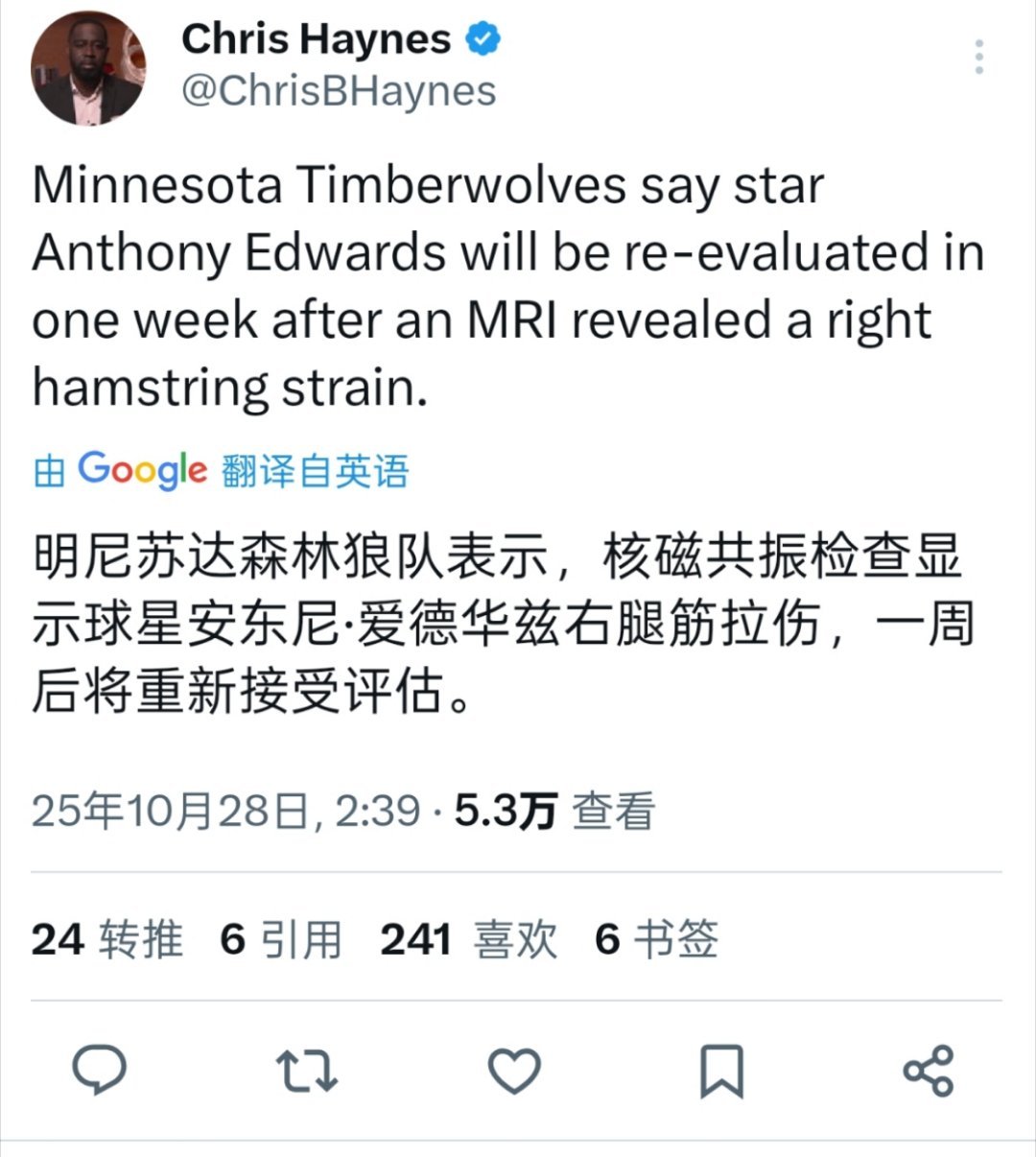 Chris Haynes:森林狼的爱德华兹因为腿筋拉伤,一周后接受重新评估