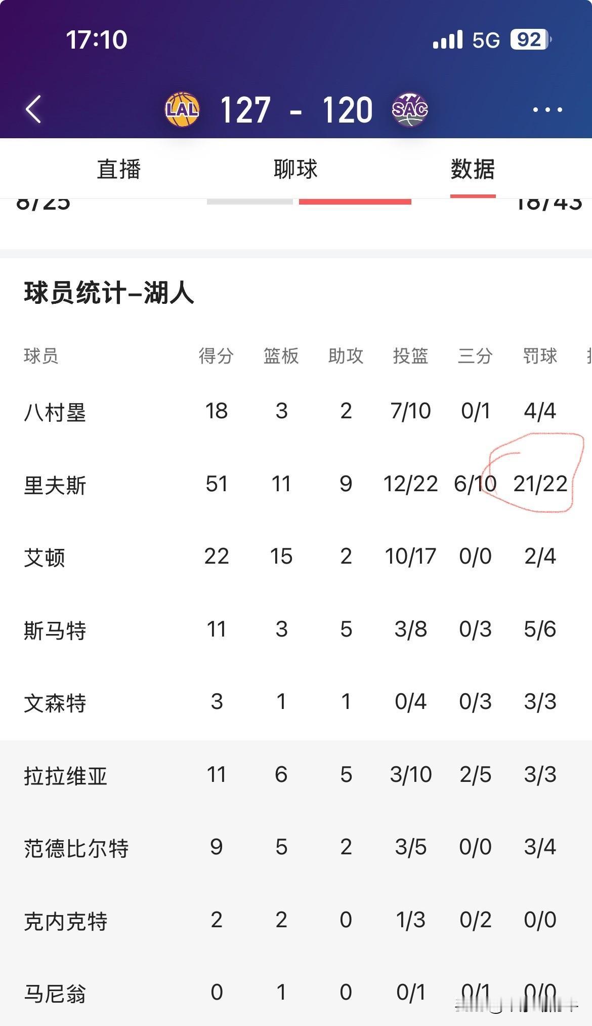 里弗斯砍下51+11+9超神数据,其中22个罚篮,帮助球队拿下国王。 湖人这人才储备简直逆天!东契奇和詹姆斯都缺席,里弗斯直接单核扛起球队,首节国王领先,他带领湖人扭转局势,分差一度扩大到10分,次节他单节狂砍14分,三记3分太炸裂。三节和末节关键时刻持续爆发,助球队127 - 120拿下比赛,取得两连胜。 詹姆斯不在时,东契奇和里弗斯兼容度明显提升,两人能同时砍高分,等詹姆斯回归,三人配合起来,湖人进攻火力更猛,战术也会更丰富,湖人这人才储备真的比勇士强太多了,不知道隔壁库里此时此刻在想什么呢?