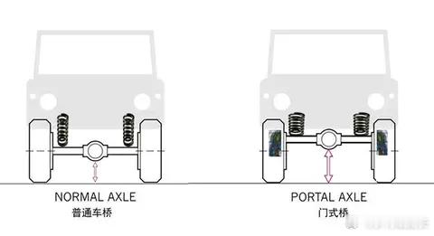 找了门式车桥的示意图,和用户改装门桥的坦克300。简单说就是,车轮上安装了一个纵向的差速装置,上半部分输入,下半部分对接车轮转动,整个桥都升高了促进离地间隙提升