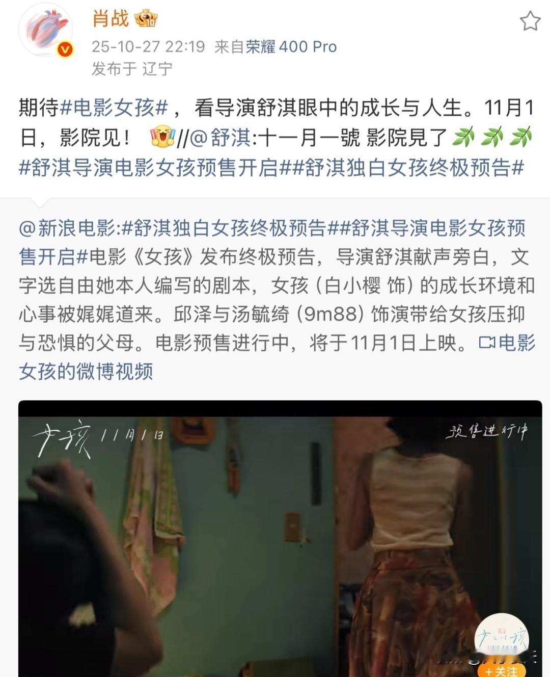 肖战宣传舒淇电影🎬 期待电影《女孩》 11月1日影院见[打call][打call]