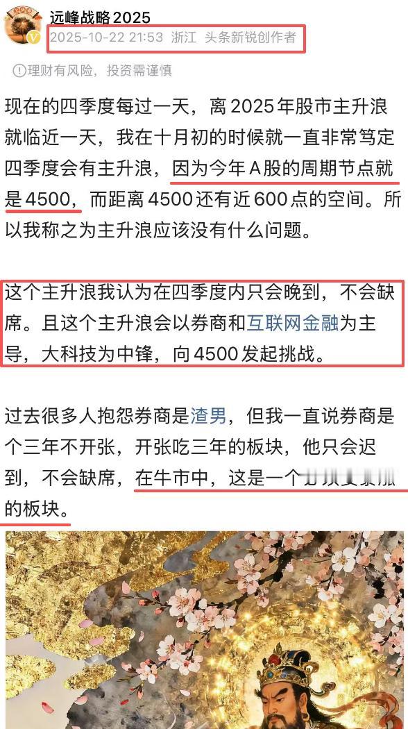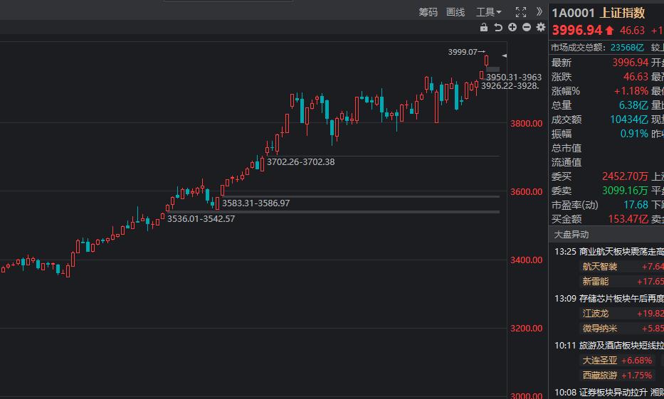 昨天的高点离4000点仅差0.93,弹指挥间的距离,我在10月中旬的时候说四季度即将迎来一轮主升浪的时候,评论区有几个人说又疯了一个。当你现在再去看上证指数的形态再结合这两篇文章,一轮主升浪的雏形是不是有点要呼之欲出的味道了? 而今自媒体时代,观点满天飞,看涨可以无上限,看跌也可以无下限,别人说今年3500,4500,5000,7000的时候,你可以当个玩笑随便听听,但是我说4500以上的时候,那就要重视了,因为他真的会到。 4000点突围倒计时:还剩4个交易日内。