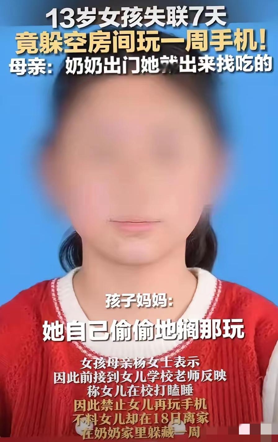 这种孩子, 抓住先饿三天! 安徽一个13岁女孩,因为上课睡觉,被妈妈限制玩手机,没想过了几天,她竟然带着手机消失了。 全家动员全村人找,最后在奶奶家空房子里揪出来——饿了就趁奶奶出门找吃的,其余时间全抱着手机不放。 很多人骂手机害了一代人,可真的是手机的错吗?现在孩子放学就对着屏幕,不是因为手机有多香,而是现实里没什么比手机更有吸引力。家长忙着赚钱,老师盯着成绩,没人陪孩子出去玩、做手工,手机自然成了唯一的寄托。 “饿三天”这种极端办法更是治标不治本,反而会让孩子更叛逆。真正该管的不是手机,是家长的陪伴和引导——多带孩子走进户外,多陪她做喜欢的事,让现实生活比屏幕更精彩,孩子才不会把手机当成唯一的精神依靠。 你家孩子平时玩手机多久?你是强硬禁止还是合理引导?来评论区分享你的育儿经!
