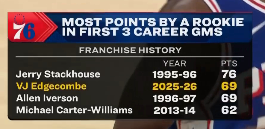 ☞76人队史里新秀前三场比赛总得分最多的几位☞埃奇科姆只要再得7分就可以追平斯塔