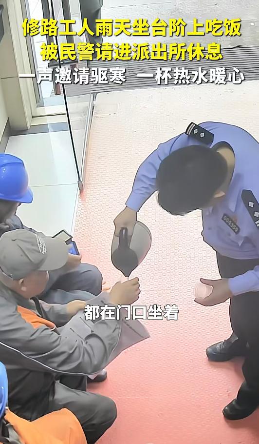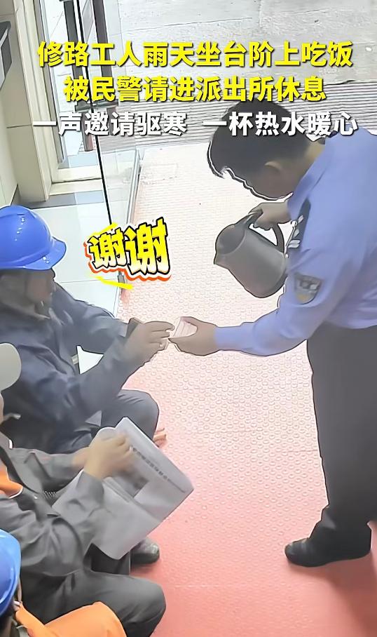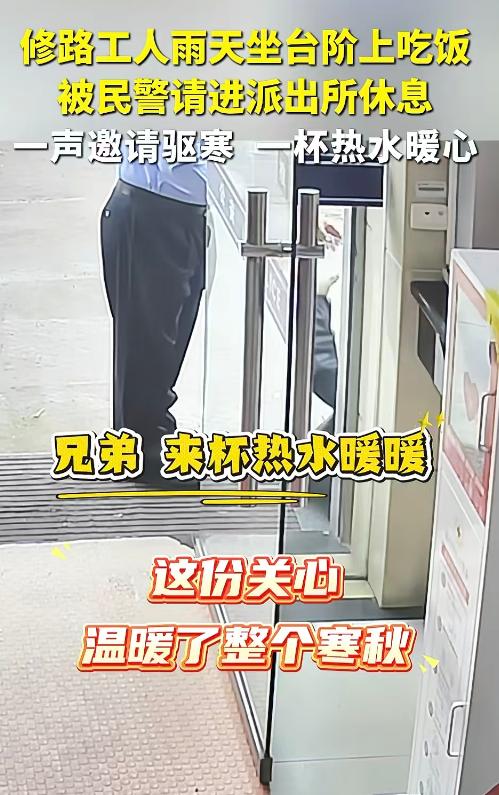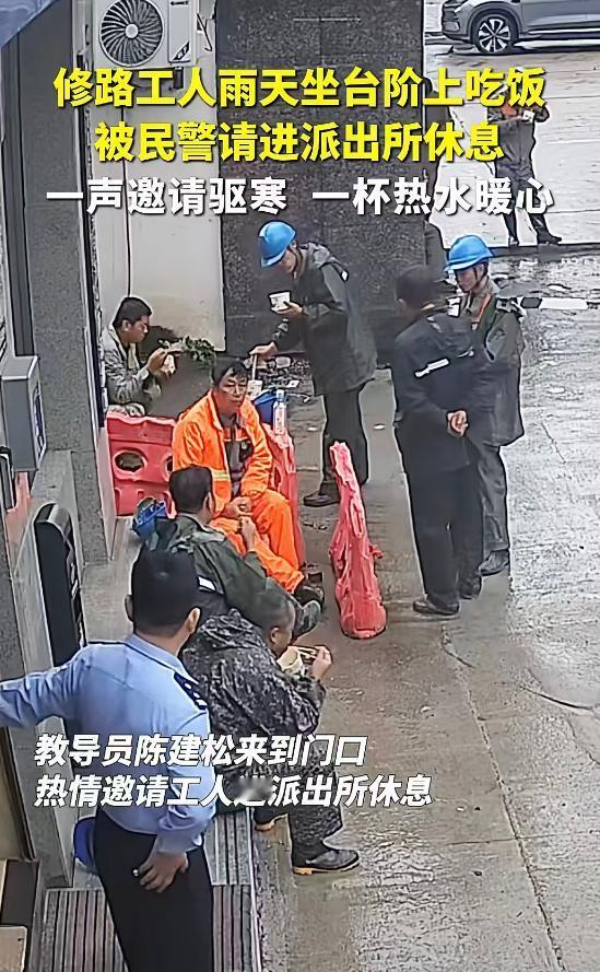 “看哭万千网友!”。近日,湖北黄石,一群修路工人雨天蹲在派出所台阶上吃饭,雨天加寒风给工人们冻得瑟瑟发抖,派出所民警看到这一幕,邀请工人师傅们进屋避雨,并用一系列举动温暖了工人们的心,也看了哭万千网友。网友:这是真正的好警察。 工人们上午干活时还是晴天,到了中午突然下起了雨来,雨虽然不大但是夹杂着寒风,再铁的汉子也承受不住,工人师傅们只能躲到派出所的台阶上一边吃饭一边避雨。 可从家里拿来的饭,经寒风一吹,早就凉了,工人师傅们只能就着寒风把午饭和委屈咽进肚子里,盼望着天空能早点放晴,下午工作时能少受点苦。 这时,教导员陈建松来到门口发现了这一幕,热情的招呼工人们进派出所休息,告诉工人们里面有位置,工人师傅们本想拒绝,但耐不住民警同志的热心邀请,就都进来了。 迎进屋内,警察同志还贴心的拿出了杯子,给每个工人师傅都倒了杯热水让工人们暖暖身子。 民警同志说,雨天这么冷,看见你们都在外面坐着,连口热水都喝不到,我心里不舒服。 视频发到网上后也引起了不少网友的热议,有的网友说,这才配得上人民警察的称呼。也有的网友说,这才是人民警察为人民,真正的人民公仆。 工人师傅们在下雨时选择到派出所避雨,是因为对警察同志的人心,而警察的热心举动也没有辜负工人们的信任。 说一声辛苦,倒一杯热水,看着是小事,却是温暖人心的大事,警察同志倒水时说的应该做到,工人师傅接过热水说的一句谢谢,这种生活中实实在在的温暖,看的让人动容。 最后给陈建松同志点赞,你的善行不仅温暖了工人师傅的心,更把温暖带出了黄石、带出了湖北、带向了全国,让人们都一同感受到了这份温暖,向你致敬!