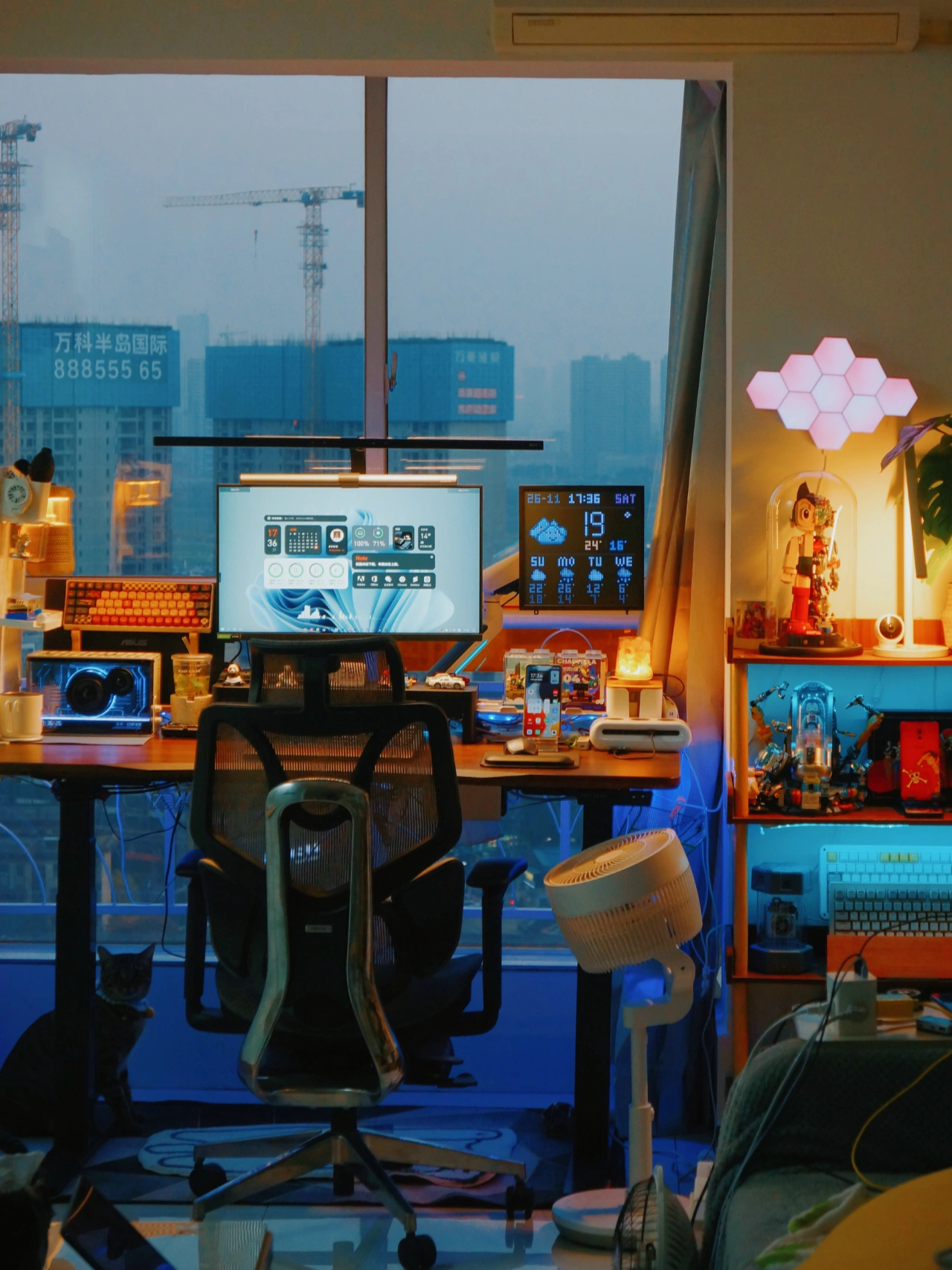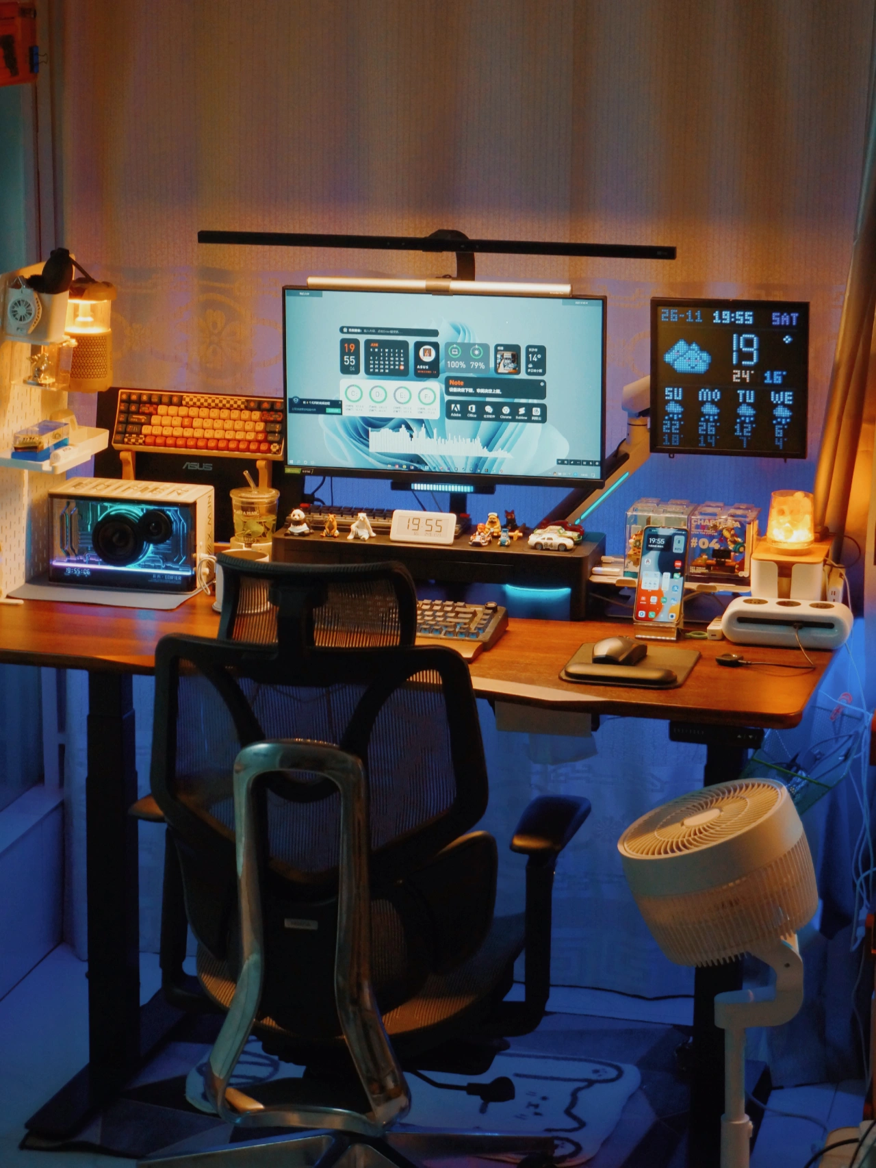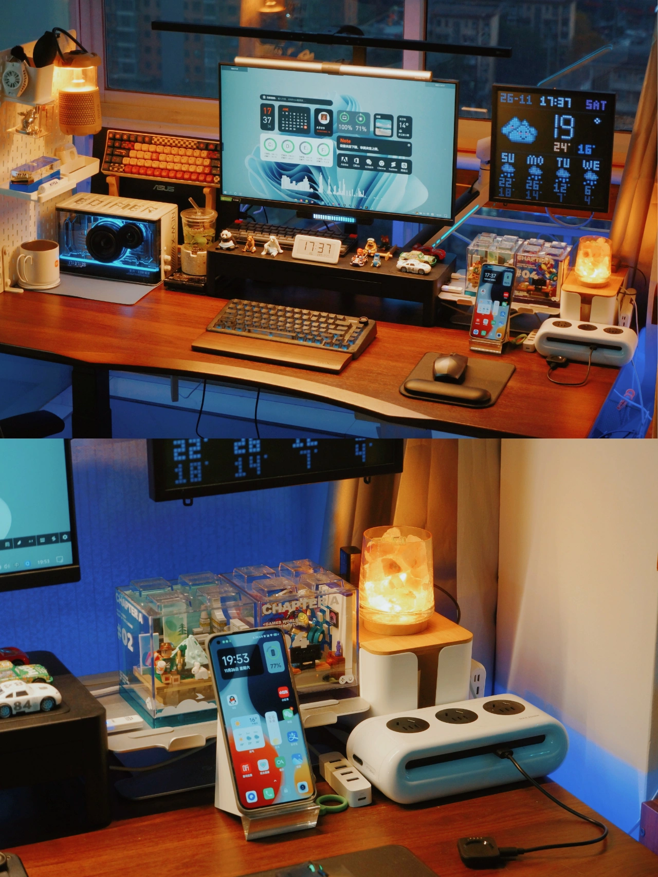 🖥️在搭配桌面上,不仅可以灵活选择颜色和光效来搭配场景,而且还有时间显示和作为桌面供电的使用功能,配有USB-C和USB-A两个接口,35w的氮化镓也可以灵活满足我的桌面供电需求。