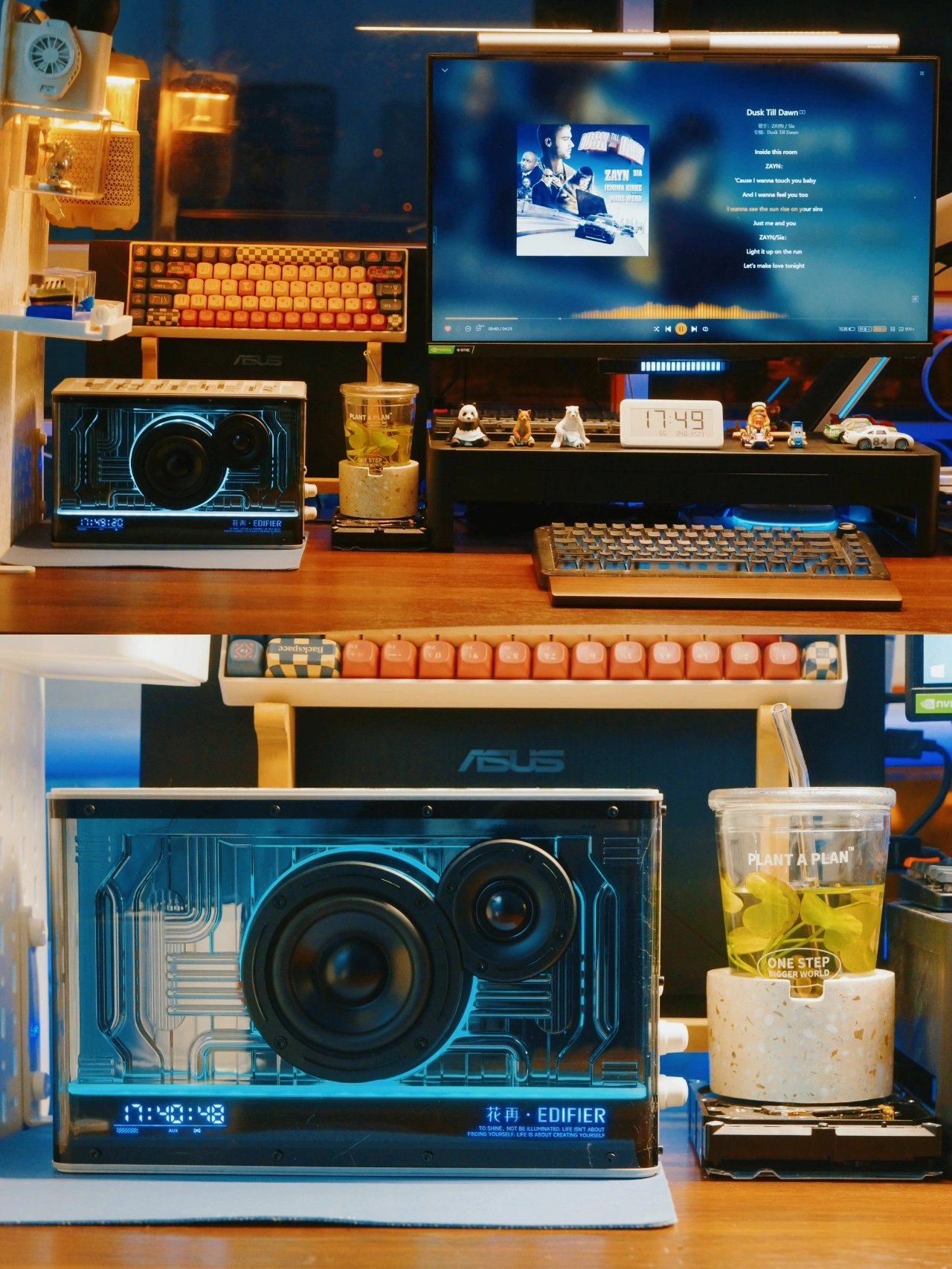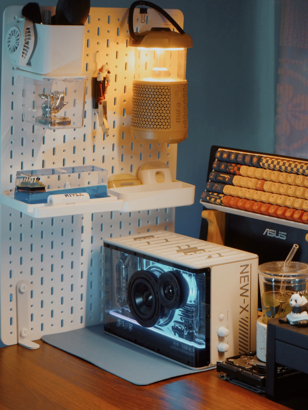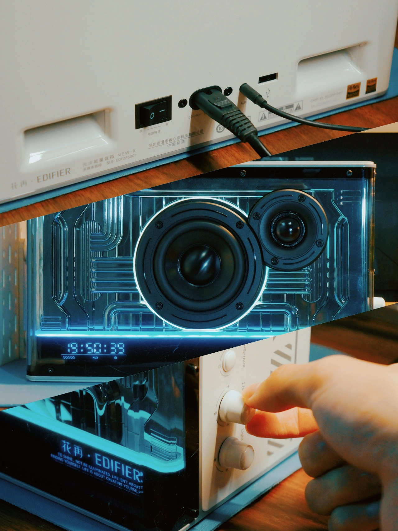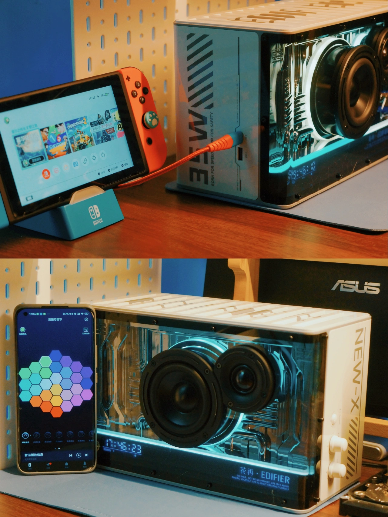 🎴最近看到了漫步者花再新发布的光冷能量音箱NEW-X,第一眼我就认为,这是可以摆在我桌面上的音箱。极光白的配色和集装箱的设计很搭我一边的白色风格,开启后,流光溢彩的灯效搭配透明外壳,感觉炫酷科技的风格点亮了整个桌面。