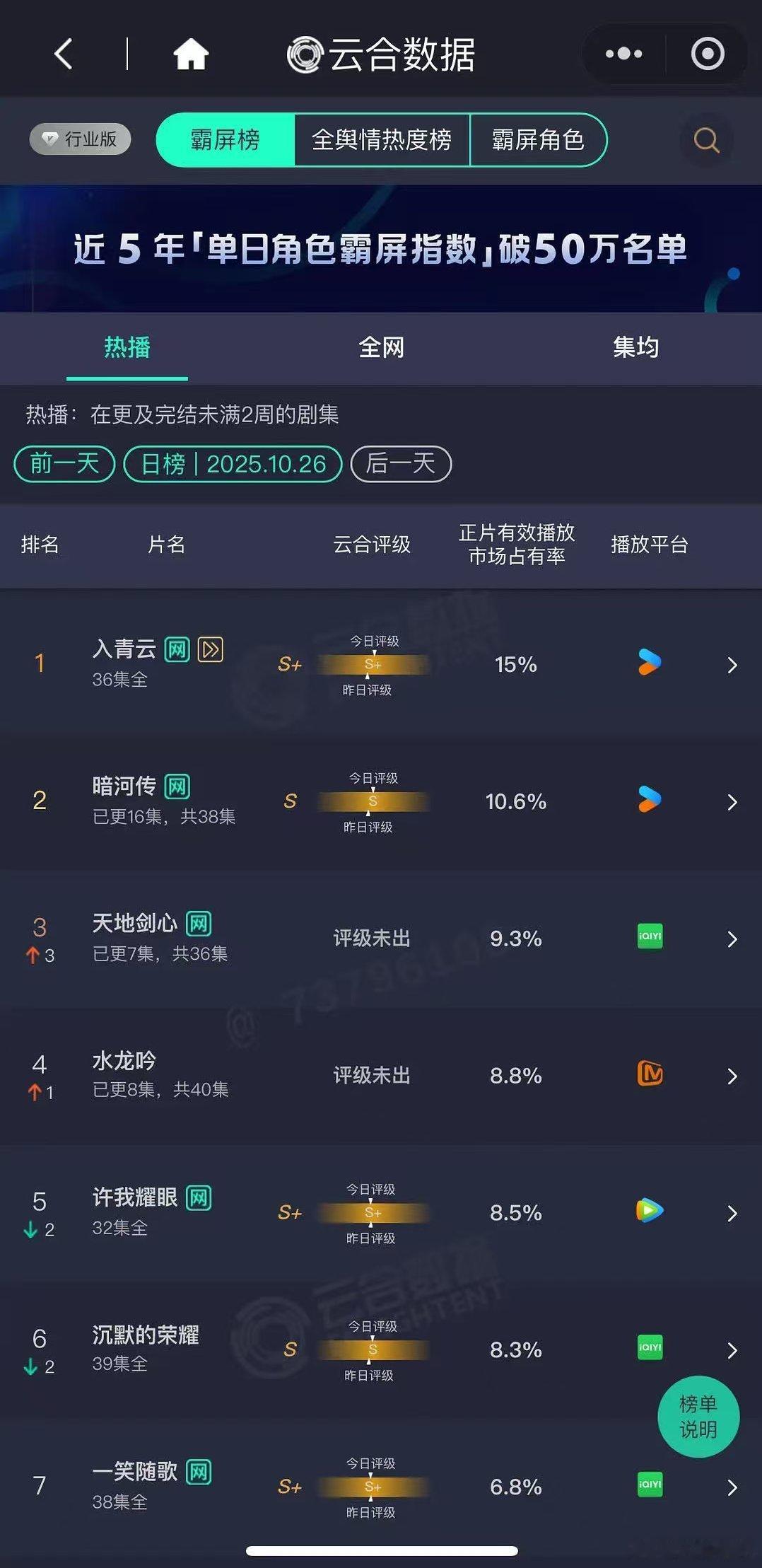 最新云合,侯明昊的入青云暂列第一,李沁陈哲远一笑随歌已经跑到第七了,戏外CP足,