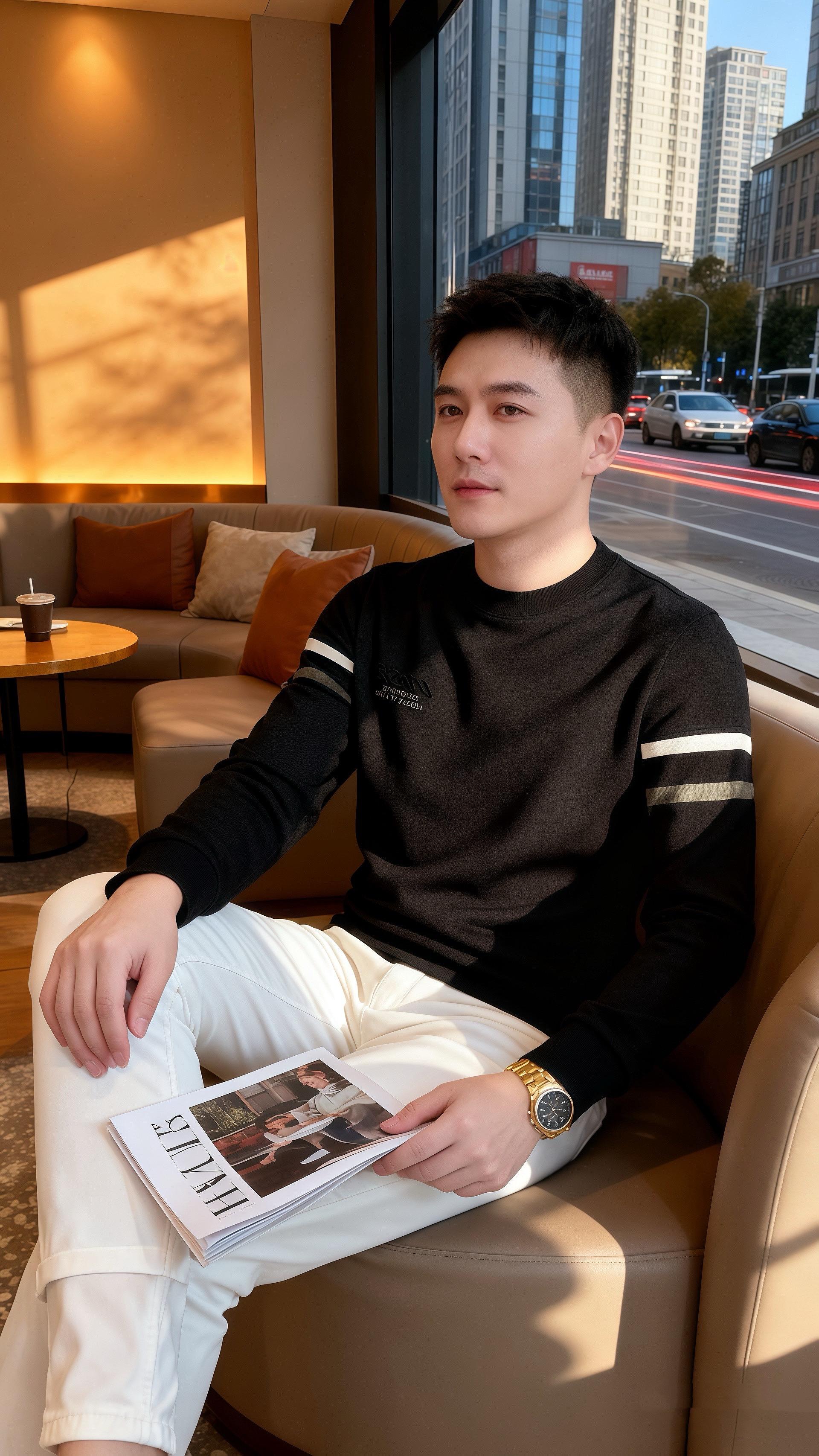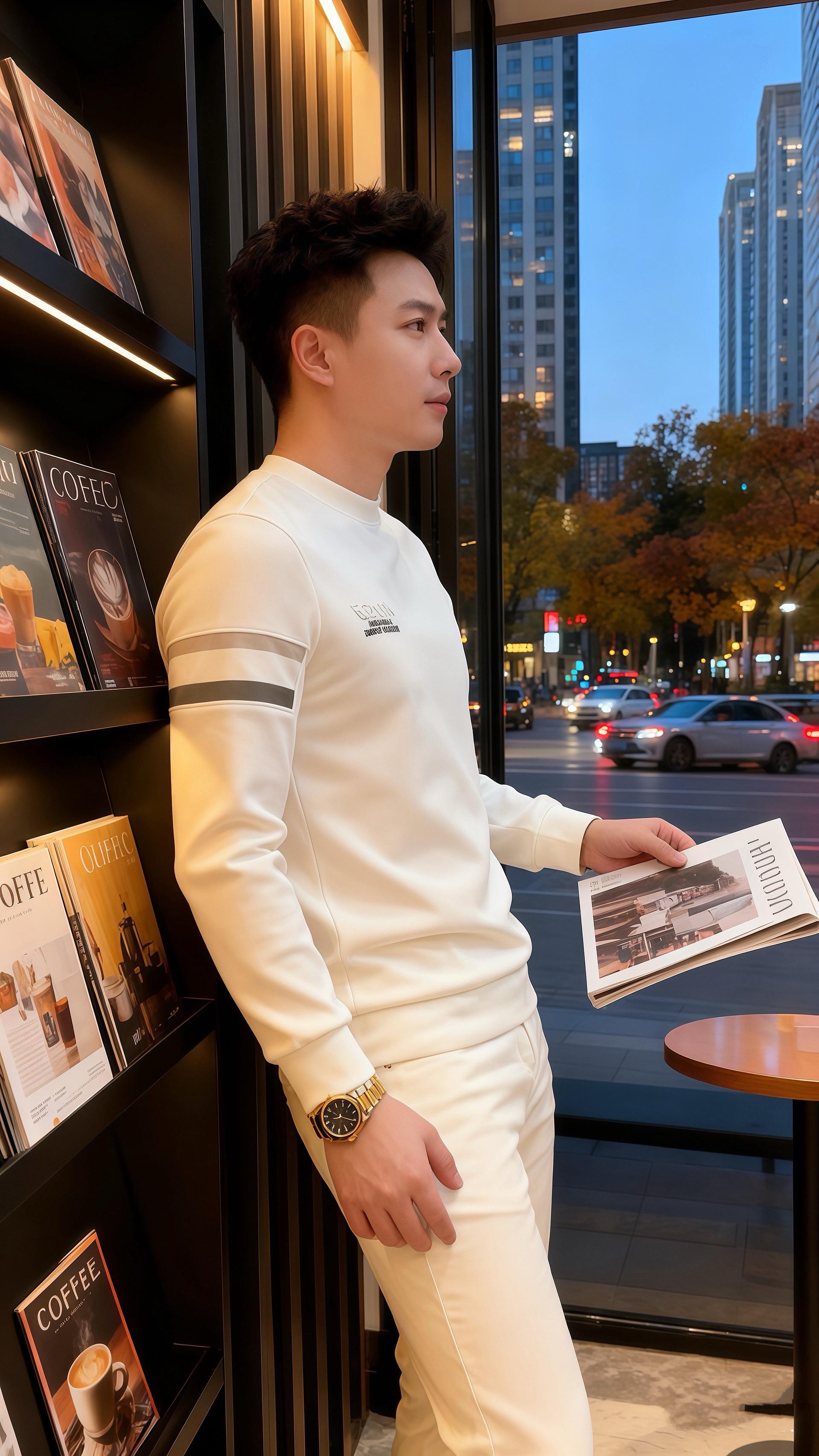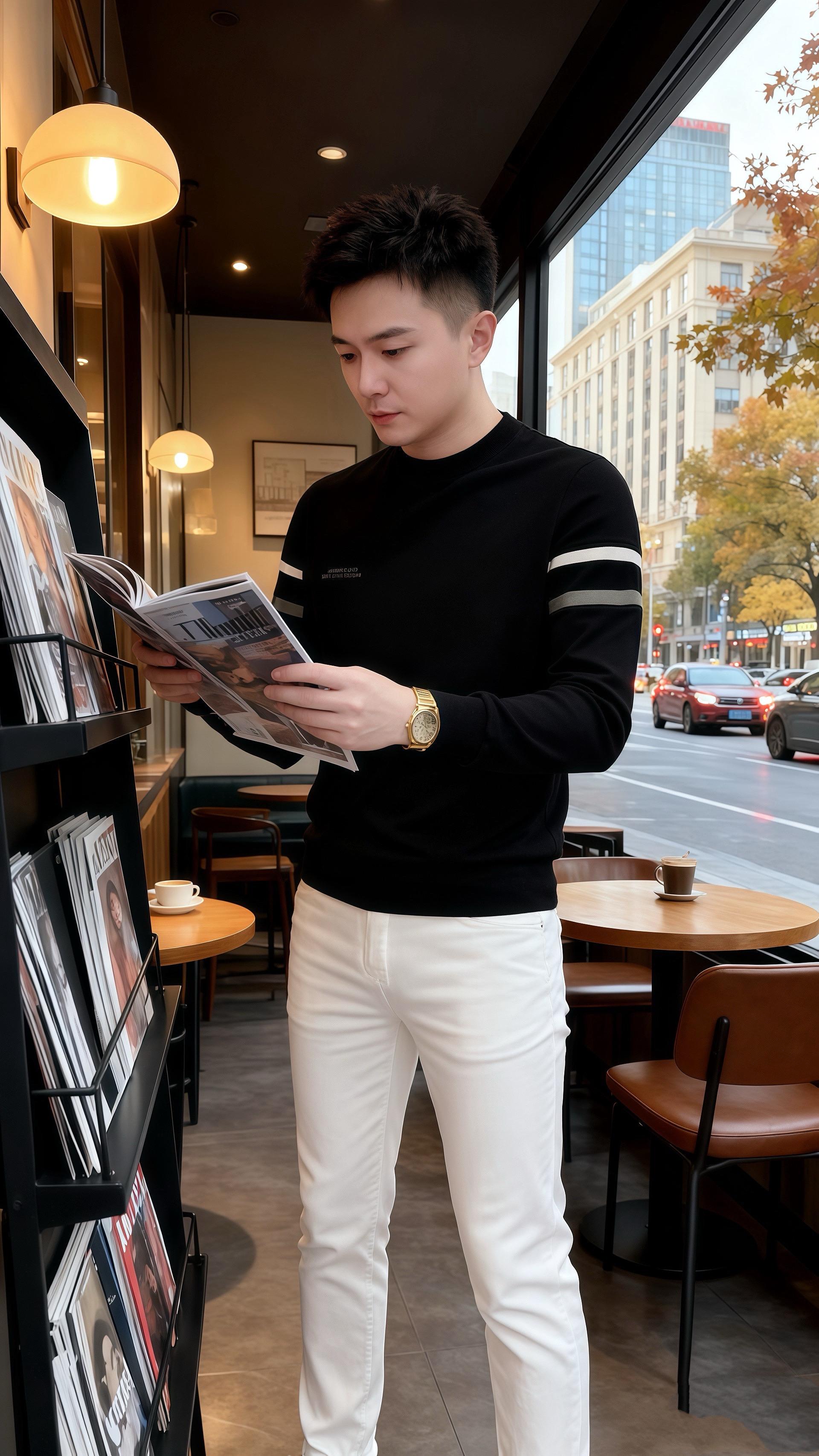 直到某天捧着杂志靠在书架旁,秋阳漫过玻璃,把黑衫袖边的条纹晒得温软,白裤沾了点书页的墨香,风裹着梧桐叶撞在窗上,他忽然松了肩。