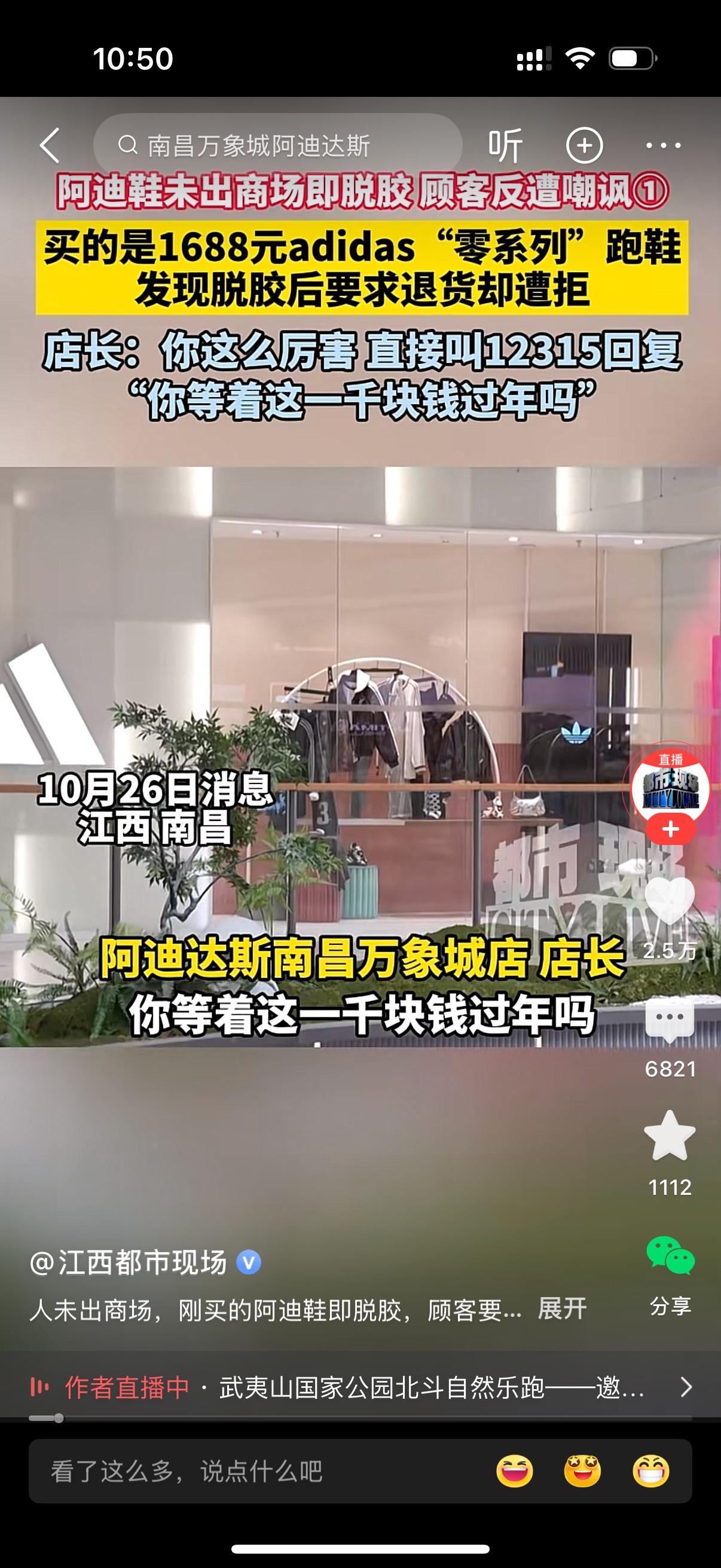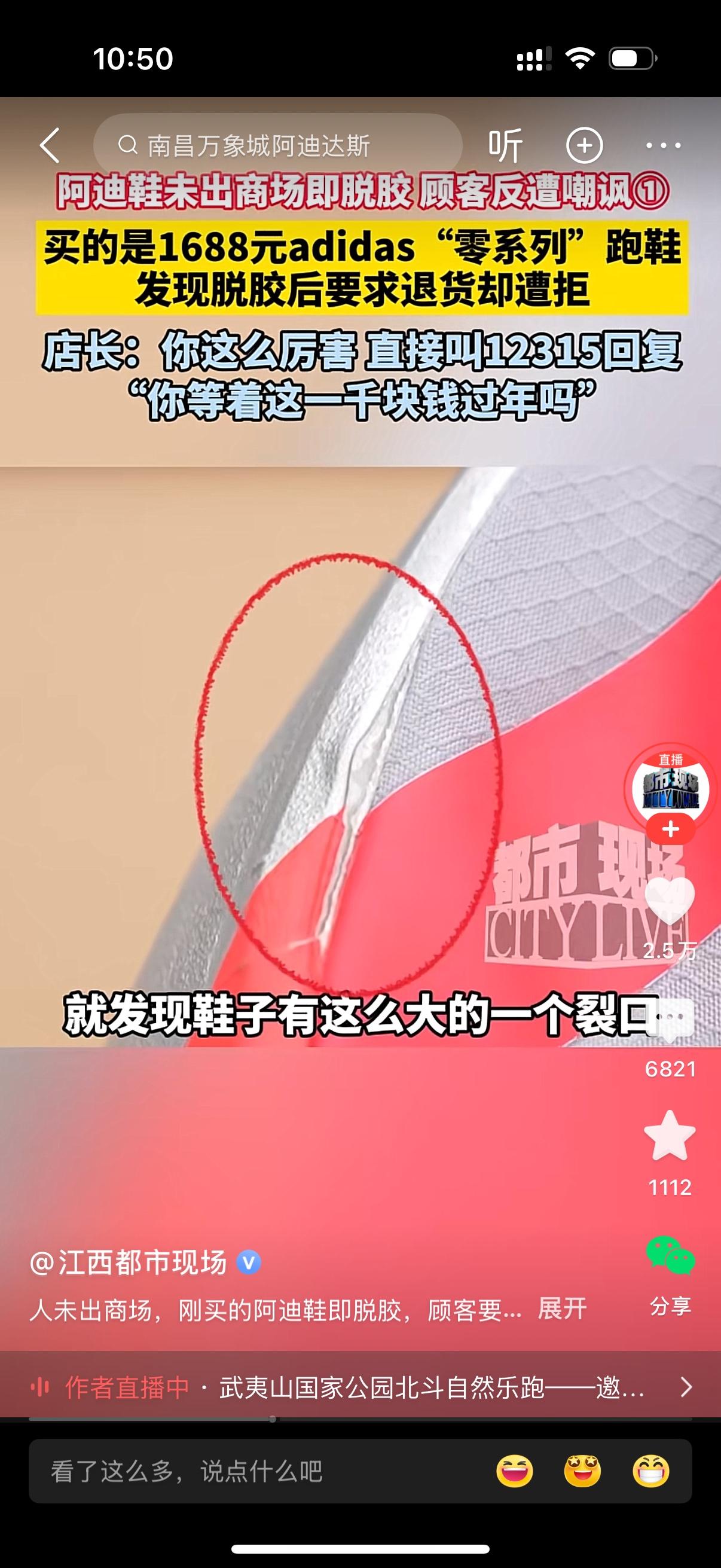女子给自己的小孩买了一双1688的阿迪达斯牌的鞋子。她还没有走出商场就发现鞋子脱胶了,有一个大裂口。女子要求退货,店长却拒绝,还说你等着这1000多块钱过年吗?你这么厉害,直接叫12315给你回复得了。买一双1000多块的鞋,还以为买了100多万的房子了?女人被店主气疯了,她没想到刚刚还笑容满面接待自己的店长是这副尊容。