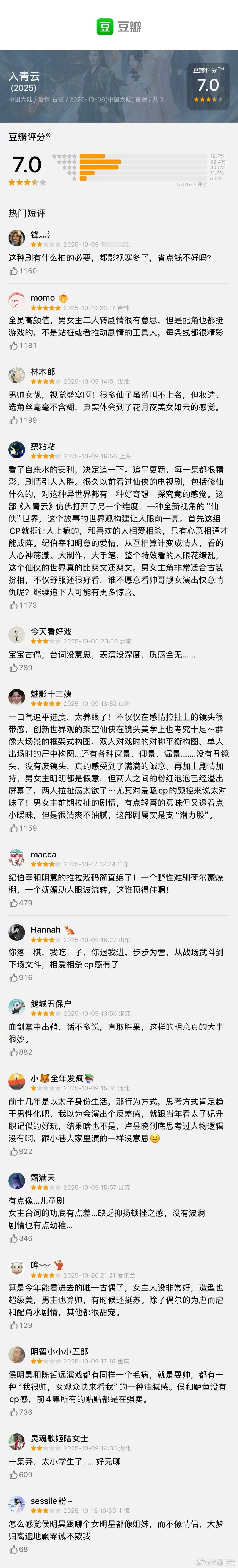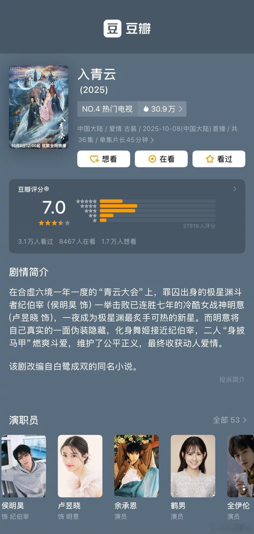 侯明昊、卢昱晓《入青云》豆瓣开分7.0分
