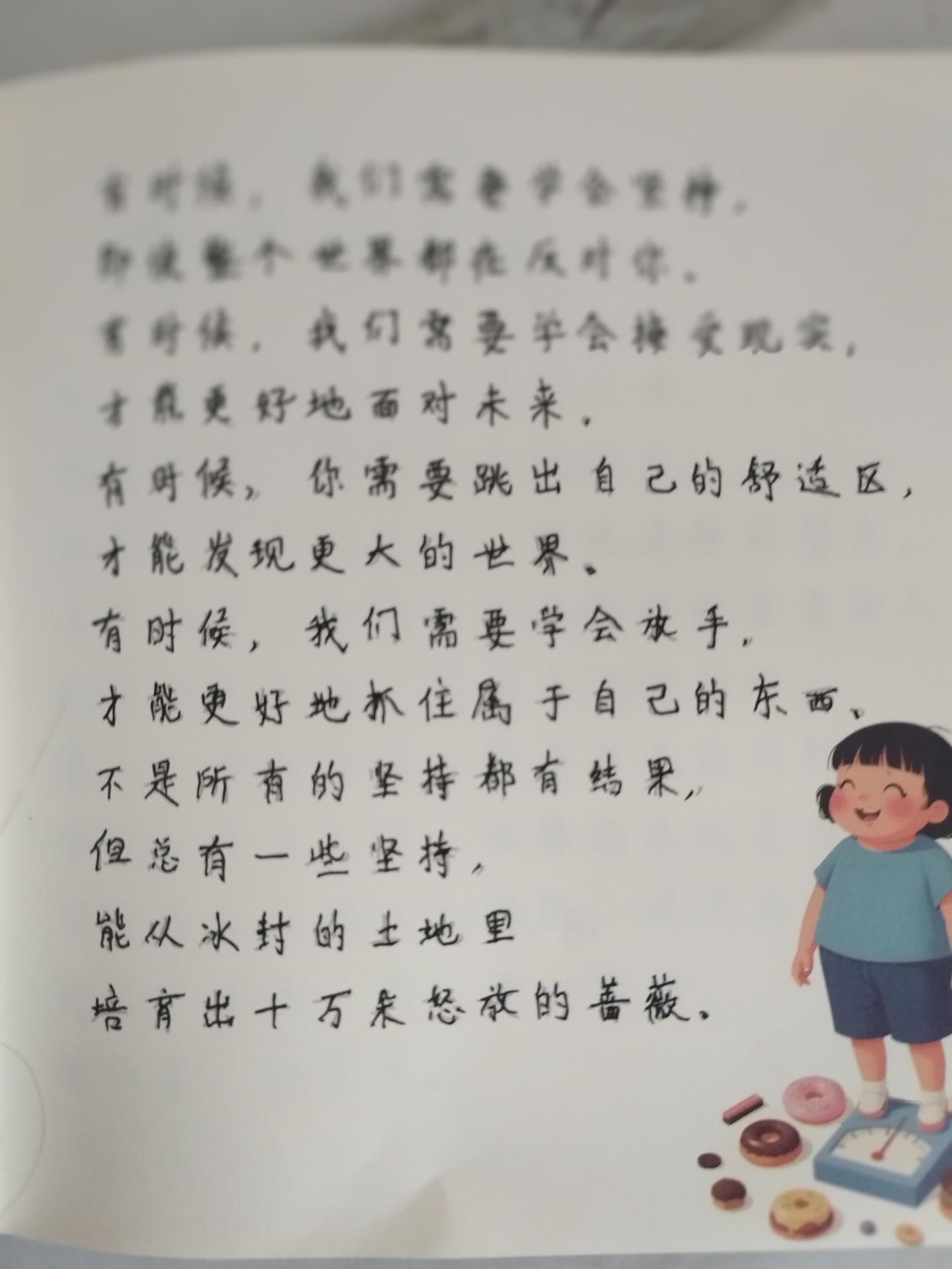 《成年人的“通关密码”:原来我们都在学这4件事》 刷到这段文字的瞬间,心脏像是被轻轻撞了一下—— 多少个深夜,你也曾在“咬牙坚持”和“体面放手”之间反复挣扎?就像图里站在体重秤上的小姑娘,身边堆着诱人的甜甜圈(多像我们怎么也舍不得丢的执念、赖着不肯走的舒适区),可她扬起的笑脸里,偏偏藏着成年人最该参透的成长真相: 🔹 有些“坚持”,是明知全世界都反对,却偏要给自己一个“不认输”的理由; 🔹 有些“妥协”,是撞破南墙后才懂:接受现实,是为了把力气留给更值得的未来; 🔹 有些“突破”,是硬着头皮跳出舒适区后,才发现世界比“安全区”大出千万倍; 🔹 有些“放手”,是攥得越紧越落空时,终于学会把掌心打开,让真正属于你的风钻进来。 就像文字里写的:“不是所有坚持都有结果,但总有一些坚持,能从冰封的土地里,培育出十万朵怒放的蔷薇。” 那些你此刻觉得“熬不下去”的纠结、“想不通”的选择,其实都是成长在给你递“通关道具”。 愿你我都能在一次次“咬碎牙往肚里咽”和“含着泪转身走”里,慢慢学会和自己的犹豫和解——毕竟,这辈子最酷的事,就是把每一次“左右为难”,都活成靠近理想生活的“垫脚石”。 你最近在“坚持”还是“放手”什么?评论区聊聊,或许有人正和你经历着同款挣扎~人生破局密码 人生通关密码 四关学习法